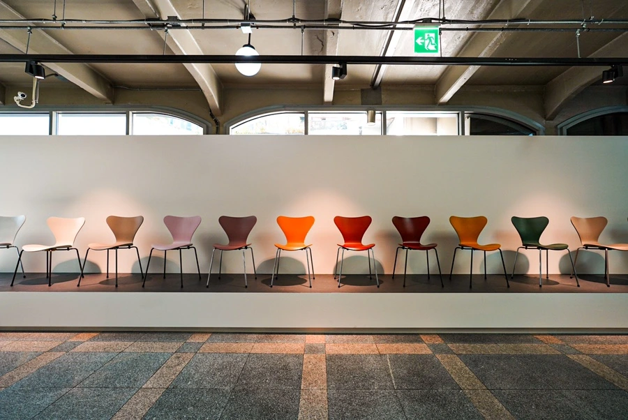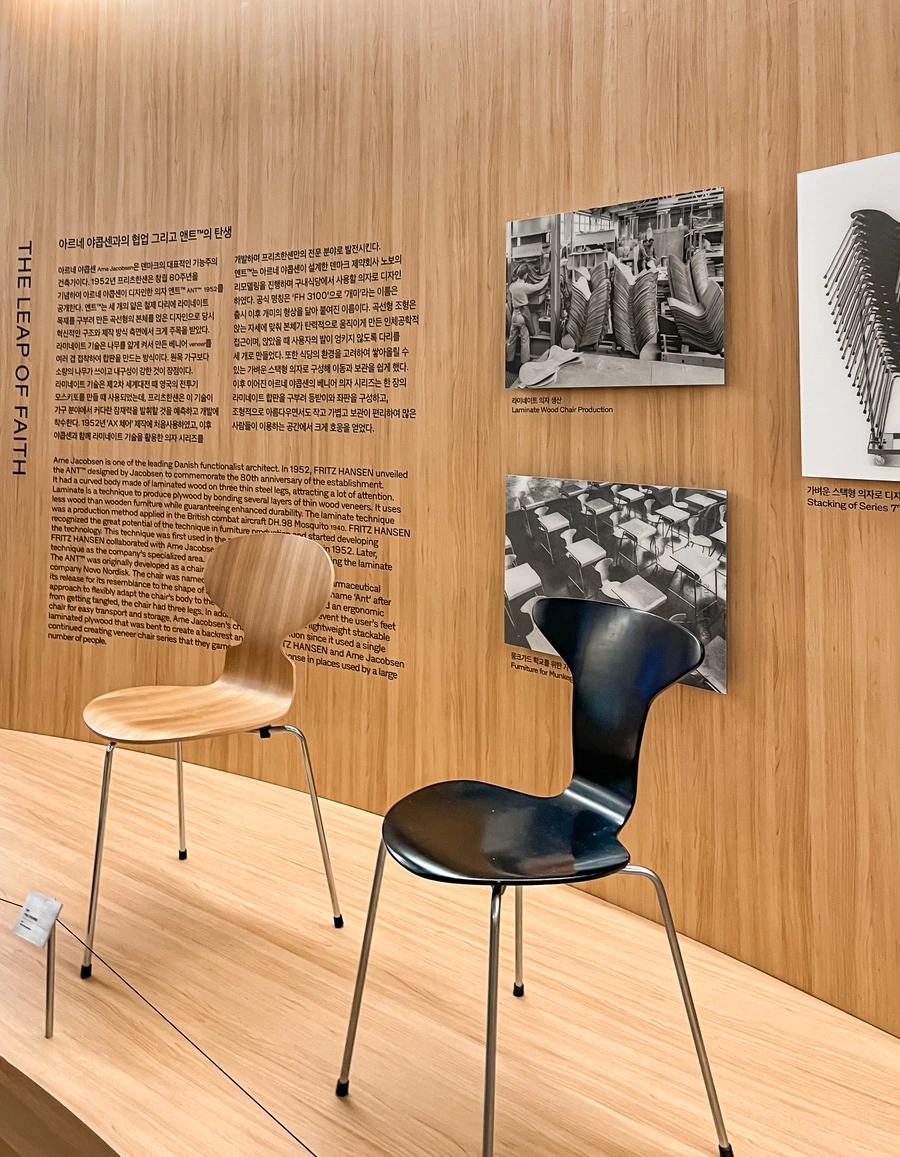 중앙 홀을 지나 3층 대합실 공간으로 들어가면 8가지 주제로 프리츠한센의 역사를 되짚어 볼 수 있는 전시공간이 펼쳐진다. 그중 우리에게 가장 친숙한 디자인의 의자 몇 점을 소개한다.