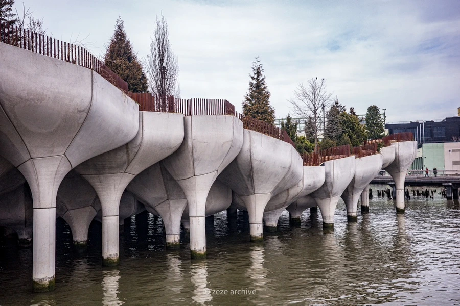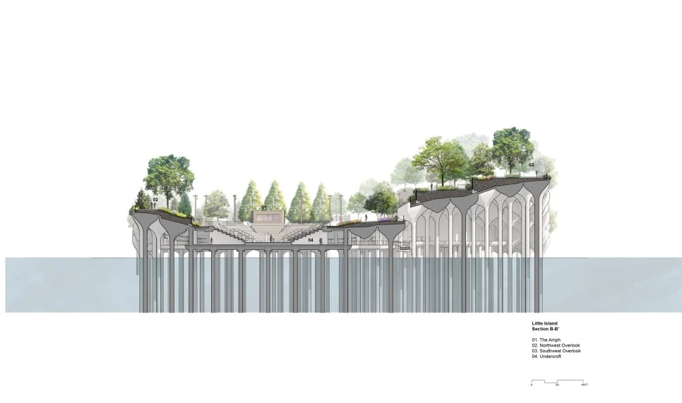 리틀 아일랜드는 뉴욕 허드슨 강가에 작년 봄에 오픈한 인공섬이자 공원이다. 그냥 공원이라 부르기엔 아쉬울 정도로 독특한 형태가 인상적인데, 섬은 마늘쫑을 닮은 콘크리트 화분으로 이루어져 있고, 맞춤 제작된 화분이 섬의 구조와 외형이 된다. 화분의 형태와 높이가 제각각이라 마치 물 위에서 일렁이는듯한 느낌을 준다.
