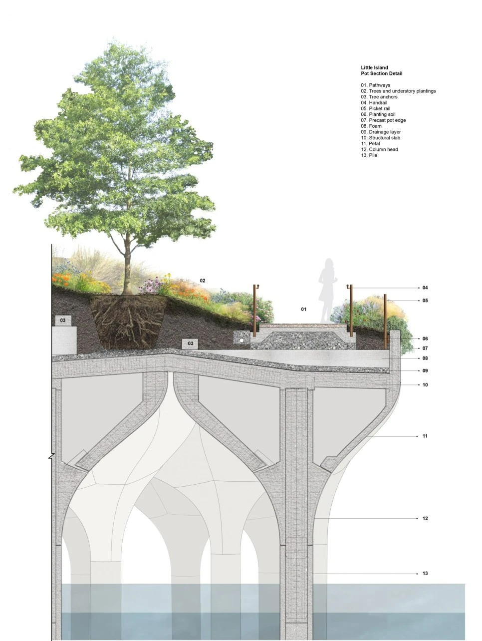 튤립 형태의 콘크리트 화분(pot)은 총 132개로 섬의 구조를 담당하며 그 안에 토양과 잔디, 관목, 교목을 심어 이름 그대로 화분 역할도 하고 있다.