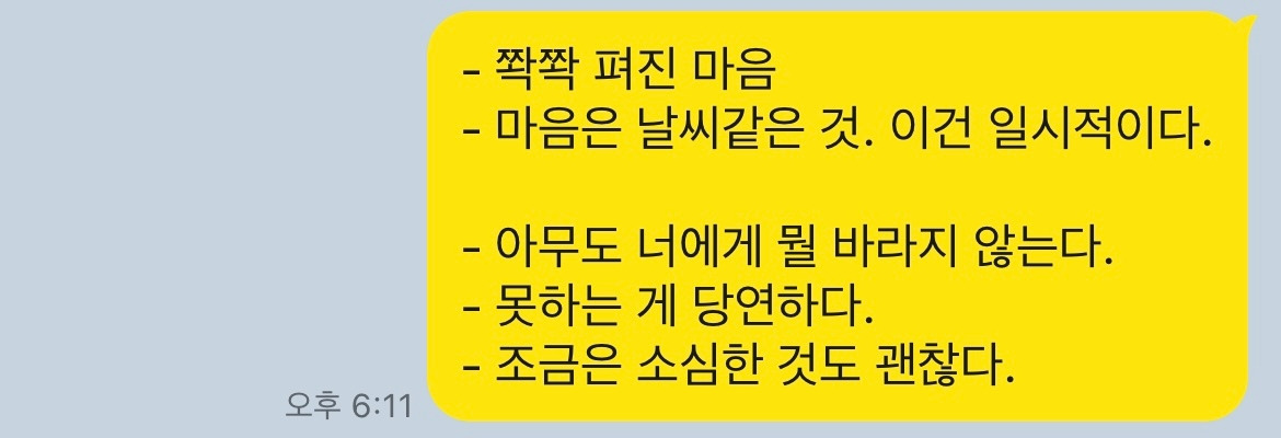 나는 어떤 여유가 생기면 나의 이름이 적힌 채팅방에 들어간다. 얼마 전 아무렇게나 던져놓았던 마음들을 바라보다가 조심히 주워 먼지를 털고, 한 번씩 안아주기도 한다.