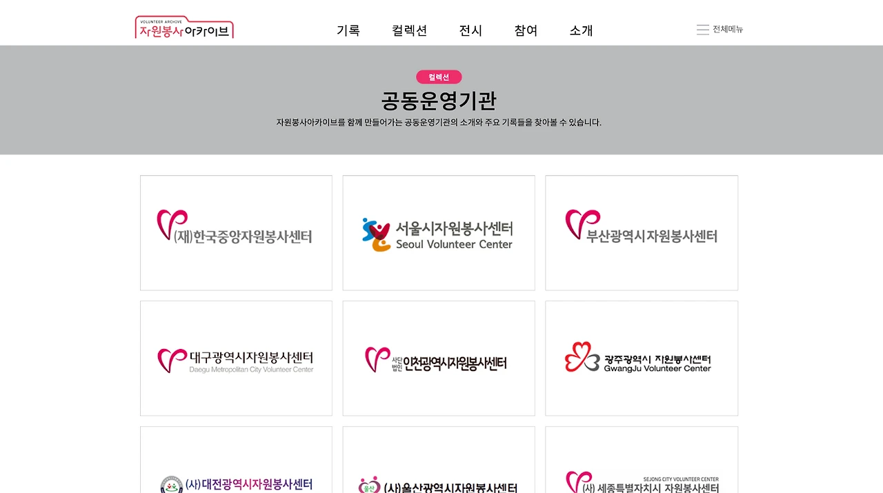 한국자원봉사 아카이브는 자체 수집, 생산한 기록도 등록하고 있지만, 지역 자원봉사센터나 협력 기관들의 자료도 수록해 놓고 있습니다. 지엽적 아카이브보다는 국내 전체 자원봉사 활동에 대한 데이터를 망라하면서, 동시에 독자적 특수성을 고려해 출처를 잘 남겨두는 세심함도 보이고 있습니다. 공동운영기관으로 등록된 다른 조직들도 아카이브에 적극적으로 동참하면서 아카이브를 중심으로 한 또 하나의 네트워크가 형성되기를 기대해 보아도 좋겠습니다.