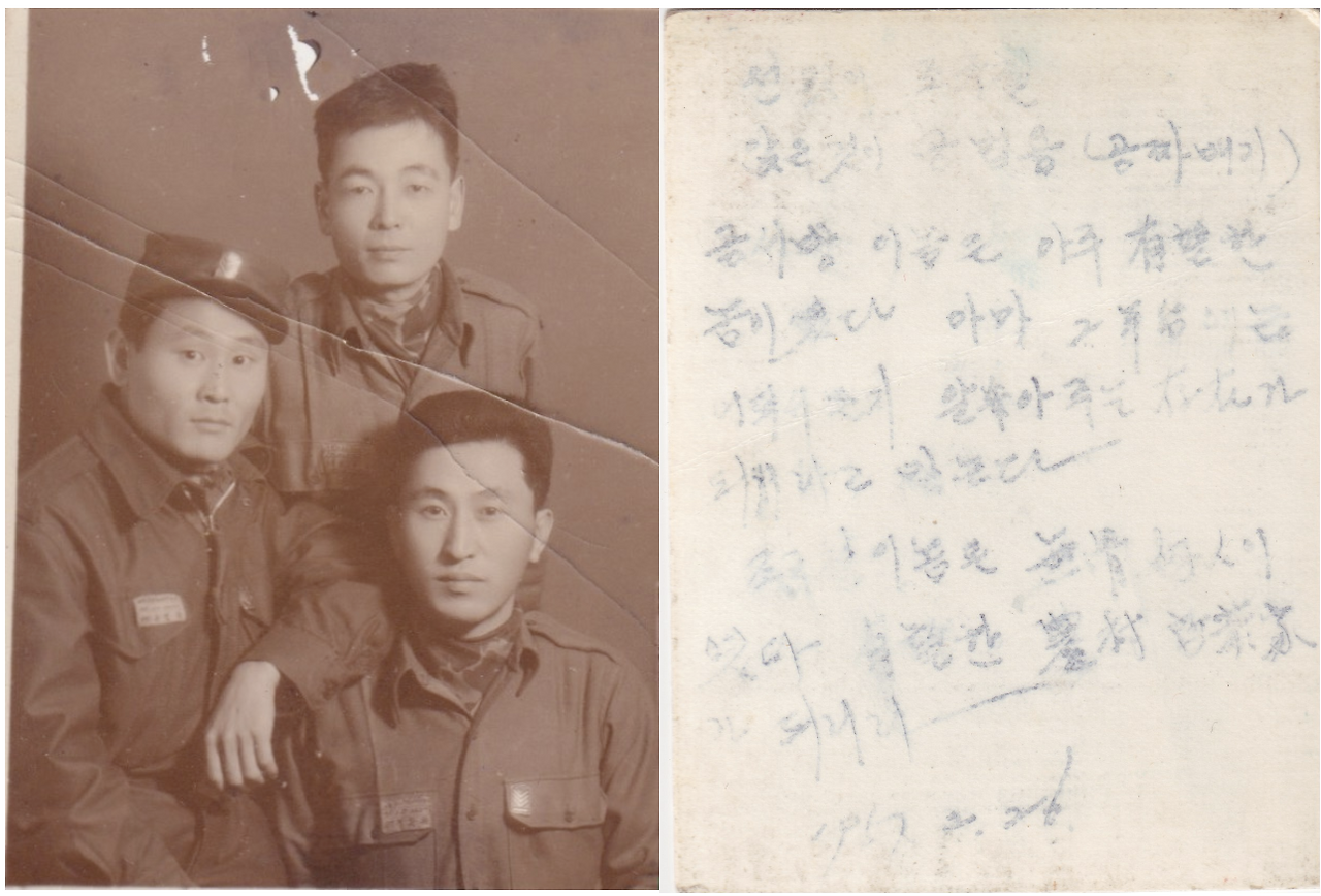 할아버지는 산림경찰로 군 복무를 하셨다고 합니다. 1957년 복무를 마치면서 함께 동고동락해 온 동기들과 기념사진을 찍으셨죠. 어김없이 그 사진의 뒷면에는 함께 해 온 사람들에 대한 추억을 메모해 놓으셨습니다. 안타깝게도 세월이 많이 지나고 보관 상태가 좋지 않아 만년필로 적어둔 글자 대부분이 지워진 상태지만, 오랜 시간 군 생활을 함께 한 동료를 잊지 않노라 기억하는 메모가 남아 있습니다.