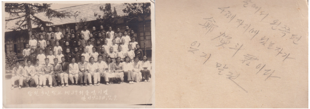 이 사진은 할아버지의 사진은 아닙니다. 할아버지의 동생인 정환두 작은할아버지의 사진이에요. 당시 합천국민학교의 졸업생들은 50명이 조금 넘는 인원. 거기에서 작은할아버지는 잠깐의 교편을 잡으셨었다고 합니다. 그 이후에 헌병대에 입대하셨다는데, 늘 엄격하셨던 얼굴이랑 썩 잘 어울리는 것 같습니다. 저희 할아버지께서 남겨둔 메모는 이렇습니다. "앞 줄에서 왼쪽 편 4째 자리에 있는자가 정환두군이다. 잊지 말 것" 아마도 첫 사회생활을 시작했던 동생의 모습을 기억에서 잊지 않기 위한 다짐이 아니었을까 싶습니다.