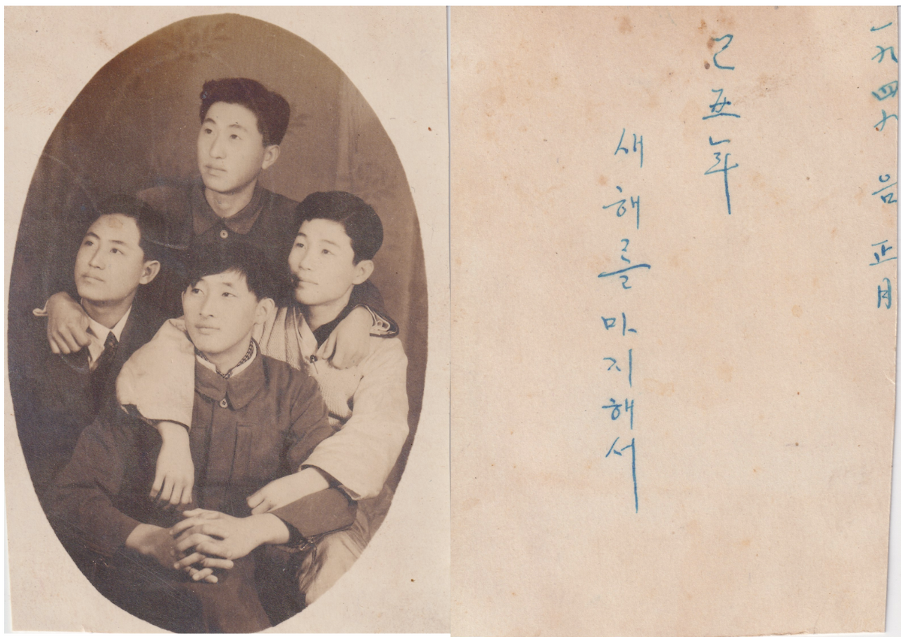 갓 스무 살이 된 시절의 할아버지는 제가 생각했던 것보다 더 낯선 얼굴이었습니다. 사진의 맨 위쪽에 서 계신 젊은이가 바로 저희 할아버지인데요. 1949년 무렵의 우정사진 포즈는 아마도 먼 미래를 함께 바라보고 함께 가자는 의미를 뜻하는 것 같아요. 아버지나 할머니께 여쭈어보아도 너무 어린 시절의 얼굴이라 어느 친구분인지 알아보기 힘들다는 이 사진에는 그나마, 1949년 새해를 맞은 네 친구들의 우정을 남기고 싶은 할아버지의 마음이 메모로 남아 있었습니다.