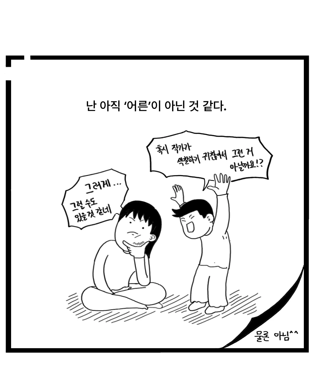 물론 아직 제가 완벽한 어른이 되지 않아 그럴 수 있습니다. 하지만 저는 제가 어릴 때 봤던 '완벽한 어른'이 평생 될 수 없을 거란 생각이 듭니다. 나이를 아무리 먹어도 여전히 부족한 저는 계속 배워야 할 것이고, 여전히 무지한 저는 한 치 앞도 예상할 수 없을 것입니다.