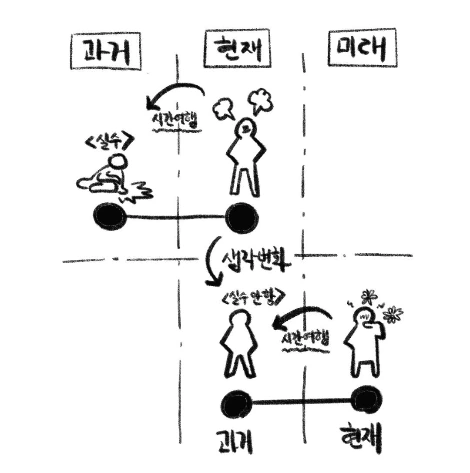 이렇게 생각했다면 우리는 이제 아까 했던 실수를 다시 하지 않으면 됩니다. 지금(타임머신을 타고 날아온 과거)은 미래(타임머신 시점으로 현재)에서 과거와 같은 실수를 반복한 '나'가 후회를 해서 날아온 타임포인트입니다. 즉 지금의 '나'가 지금이 과거라는 인식하는 순간 현재는 미래의 과거가 되고, 현재의 '나'가 과거와 같은 실수를 다시 하지 않게 되면 미래의 '나'는 내가 했던 다짐을 이루는 겁니다.