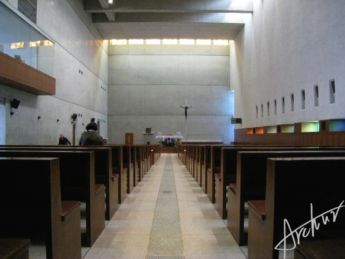 본당에서 빛은 남쪽 벽과 동쪽의 제단 상부 천정 그리고 남쪽 벽에 낮은 수평으로 긴 창, 제단 남쪽과 북쪽 2층으로 오르는 계단에서 불규칙적으로 들어온다. 하지만 모든 빛은 직접 들어오기보다는 스테인드 글라스Stained glass나 젖빛 유리Frosted glass를 통해 은은하게 스며든다. 신을 단박에 설명하는 말은 '변신 가능한'이다. 모양을 자유자재로 바꿀 수 있는 신은 그래서 신자들이 세상 어느 곳에 있든지 만날 수 있고 동시에 감시할 수 있다. 하지만 이런 설명은 신자들에게 너무 어렵다. 신자들이 한 번에 느낄 수 있는 무엇이 필요하다. 이 지점에서 신학자들이 선택한 건 '빛'이었다. 빛은 어디에나 있고 느낄 수 있지만 그 모양을 설명할 수 없다. 심지어 종교를 믿지 않는 사람들도 빛은 장엄하고 때로는 빛의 사소한 연출에 무엇인가를 느끼고 눈물을 흘린다. 인간의 탄생이 신에 의한 것임을 믿는 천주교와 기독교에서 만물 생성의 과정에 대한 설명은 빛에 대한 경험으로 빗대어진다.