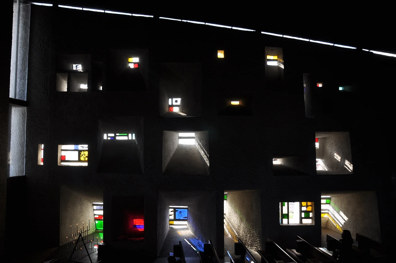 결국 롱샹성당에서도 건물의 하중을 지지하는 건 벽이 아닌 기둥이다. 철근콘크리트를 통해 하중으로부터 자유로워진 입면은 한없이 얇아질 수 있지만 반대로 한없이 두꺼워질 수도 있다. 또한, 한없이 넓어질 수 있는 창은 반대로 한없이 작아질 수도 있다.