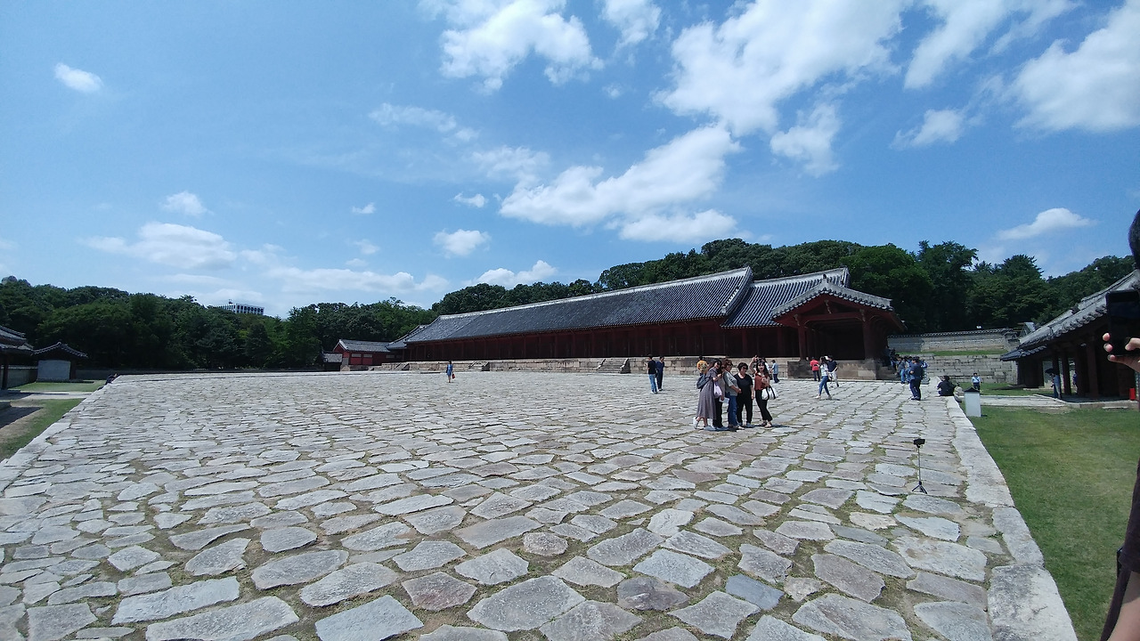 정전 앞에는 월대가 있다. 사실 정전의 압도감은 월대로 인해 훨씬 커진다. 월대에서 종묘 제례와 같은 의식이 펼쳐지기도 하지만 대부분은 빈 상태로 남겨져 있다. 한가운데를 지나는 신로와 불규칙한 박석으로 채워져 있는 월대는 땅보다 1m 정도 올라가 있지만 신위가 모셔져 있는 곳보다는 1.5m 정도 내려가 있다. 땅이 살아있는 자들의 세계이고 신위가 모셔져 있는 자리가 죽은 자들의 세계라면 월대는 그 중간 영역이다. 산 자의 공간도 그렇다고 죽은 자의 공간도 아닌 월대에서 나에게 가장 편한 자리는 모서리다. 모서리 끝에 서서 월대와 정전을 바라보면 마치 하나의 세계에서 살짝 벗어나 제삼자의 입장이 된 듯하다.