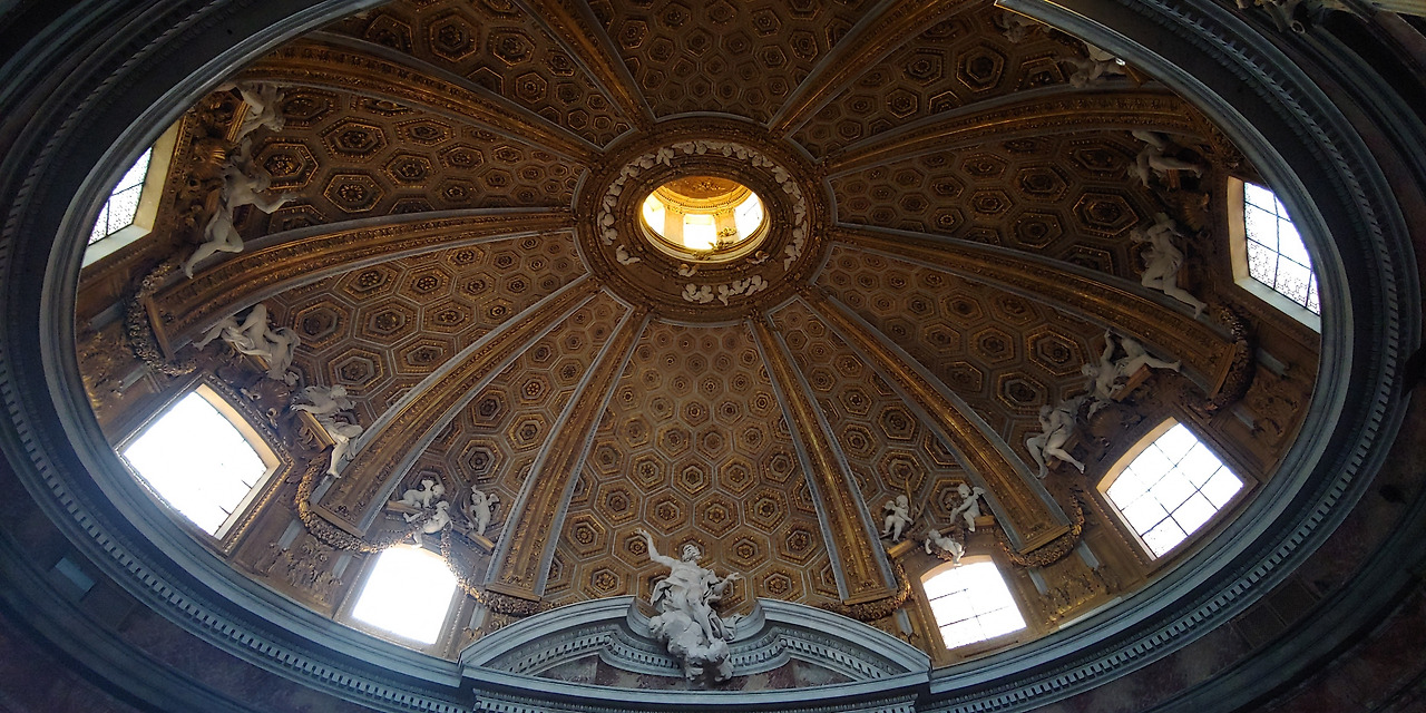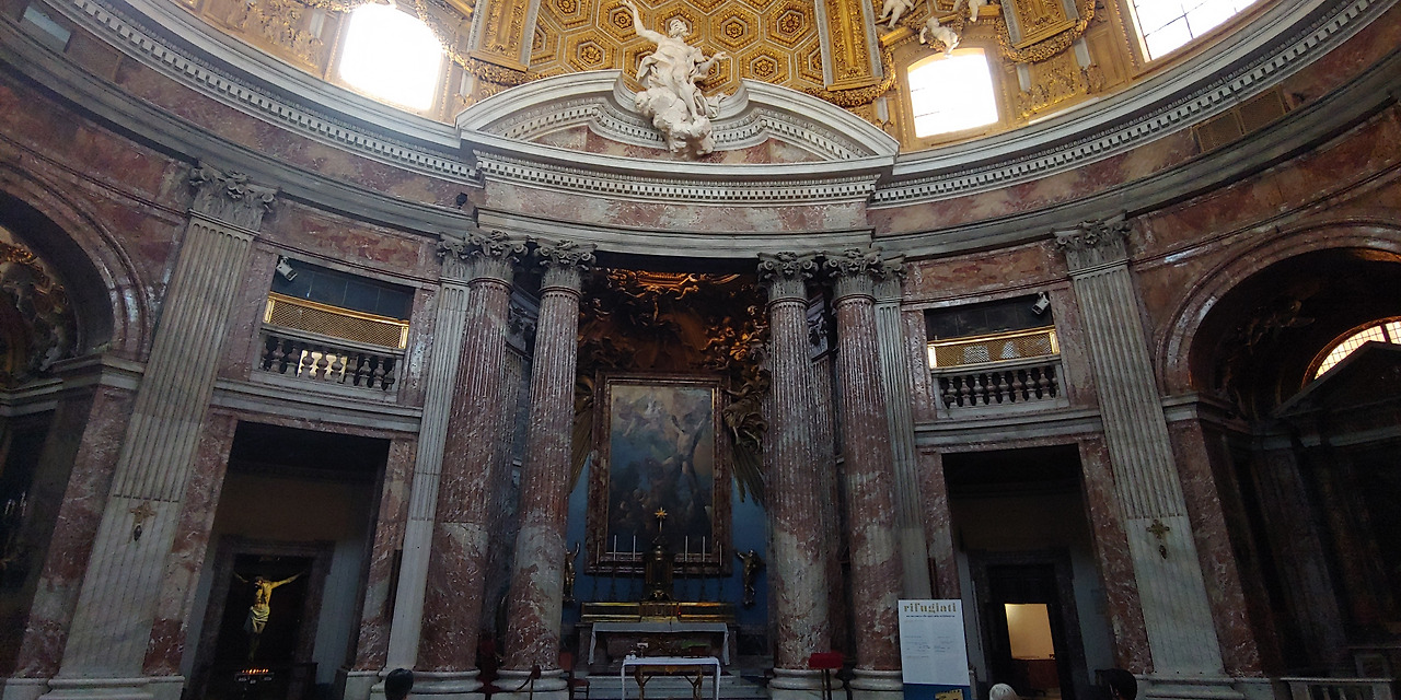 성당 안으로 들어서면 가장 먼저 ‘성 안드레의 순교’라는 그림이 걸린 제단이 보인다. 어두운 성당 내부에서 유독 그곳만 환하게 빛나고 있기 때문이다. 기욤 쿠르투아(Guillaume Courtois)의 그림 속에서 성 안드레는 ‘X’자 십자가에 매달려 순교하기 전 천사를 만난다. 천사는 손가락으로 천국을 가리키고 있고 성 안드레도 그쪽을 바라보고 있다. 천사의 손가락을 따라가면 조반니 리날디(Giovanni Rinaldi)가 만든 광채를 표현한 형상과 천사들의 조각이 보인다. 그 위에 정면에서 봤을 때 보이지 않았던 작은 타원형 채광창을 통해 은은하게 빛이 쏟아져 들어온다. 제단은 건축을 통해 들어온 빛과 이를 형상화한 조각 그리고 이 둘을 이야기로 담은 그림이 완전체를 이루고 있다.