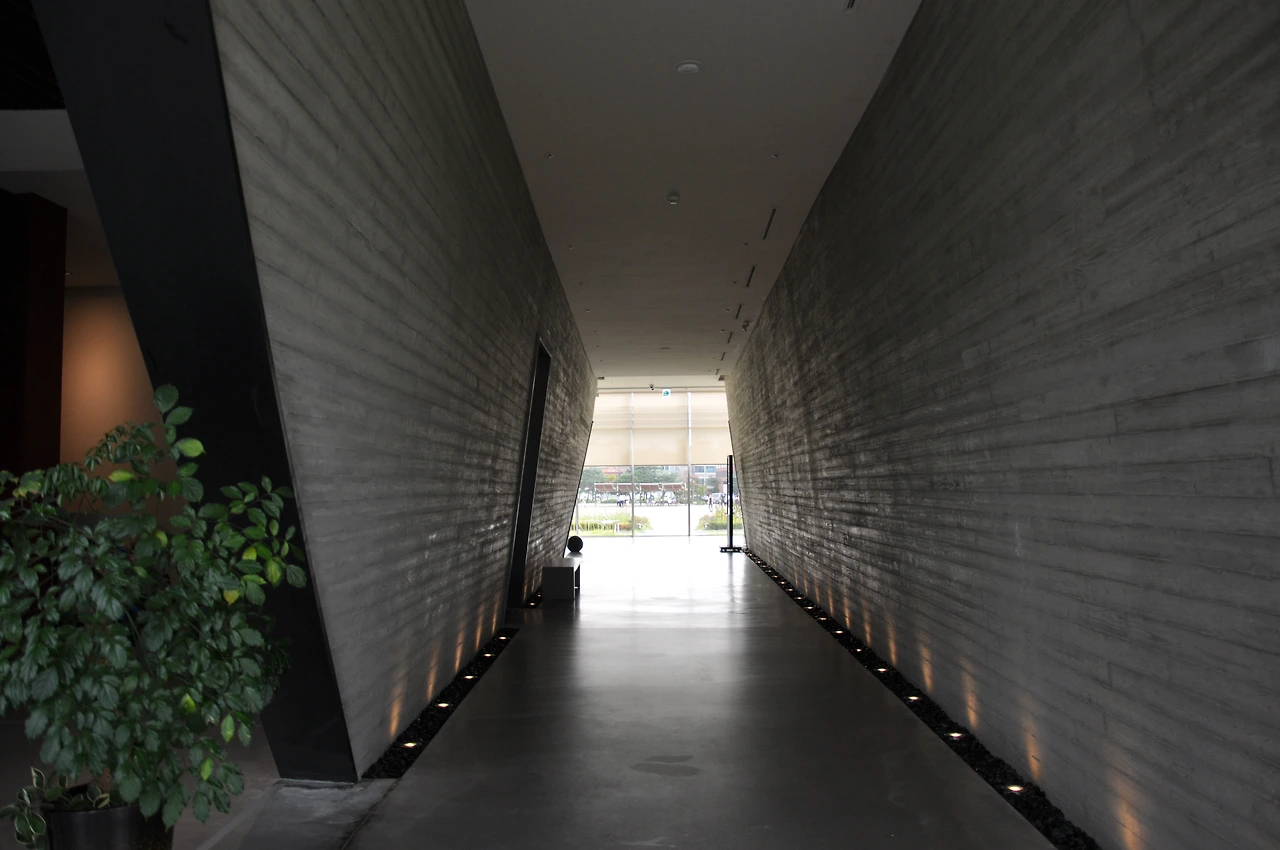설계자의 설명과 도시에서 투과성의 개념을 차치하더라도 수원시립미술관이 과거 그 자리에 있었던 구불구불한 골목길이 그랬듯 화성행궁 광장과 주변 도시조직을 연결하기 위해서는 미술관을 가로지르는 복도가 제 역할을 해야 한다. 복도는 전시공간을 담고 있는 상대적으로 큰 덩어리 사이로 나 있다. 그래서 좁고 길다. 여기에 복도 양쪽 벽을 사선으로 기울인 건축가의 감각이 더해져 마치 암석 사이에 만들어진 계곡 같다. 수원시립미술관 홈페이지나 설계자의 설명에 따르면 복도 양쪽의 경사 구획은 건물의 가장 큰 특징이자 설계자가 가장 공들인 부분이다. 심지어 한 언론에 실린 기사에 따르면 “화성의 견고함과 성벽의 질감을 보여주기 위해 (경사 구획에) 송판 무늬 거푸집을 활용했다”라고 한다.