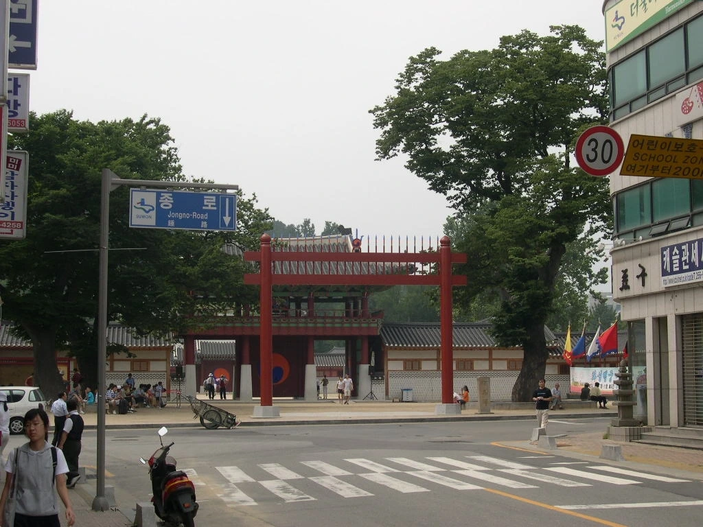 당시 화성 내 골목길에서 가장 인상 깊었던 건 길을 걷다 어느 순간 나타나는 화성과 옛 건물들이었다. 두 사람이 어깨를 맞대고 간신히 걸을 만한 폭의 골목길이 조금 넓고 반듯한 길을 만났을 때 화성과 그 안에 옛 건물들이 갑자기 나타났다. 하이라이트는 화성행궁의 정문인 신풍루(新豐樓)가 보이는 장면이었다. 팔달산의 북쪽 능선을 배경으로 신풍루가 있었고 그 앞에 홍살문은 종로의 끝에서 또 하나의 프레임(frame)을 이루고 있었다(아래 사진).