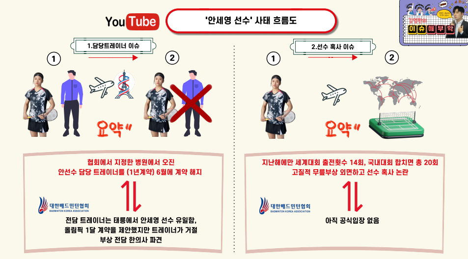 이때 이제 협회에서 말하기는 전담 트레이너는 태릉에서 안세영 선수만 유일했고 올림픽 한 달 개학을 제안했지만 트레이너가 거절했다.