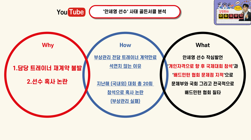 안세영 선수 사태 에 대해서 골든 서클 법칙으로 분석해 보도록 하겠습니다.