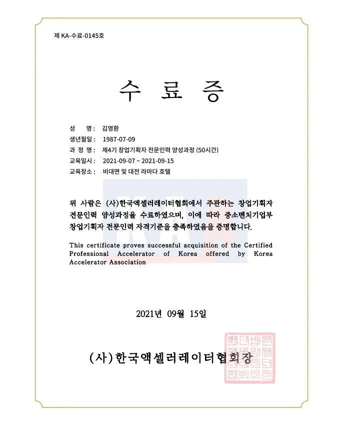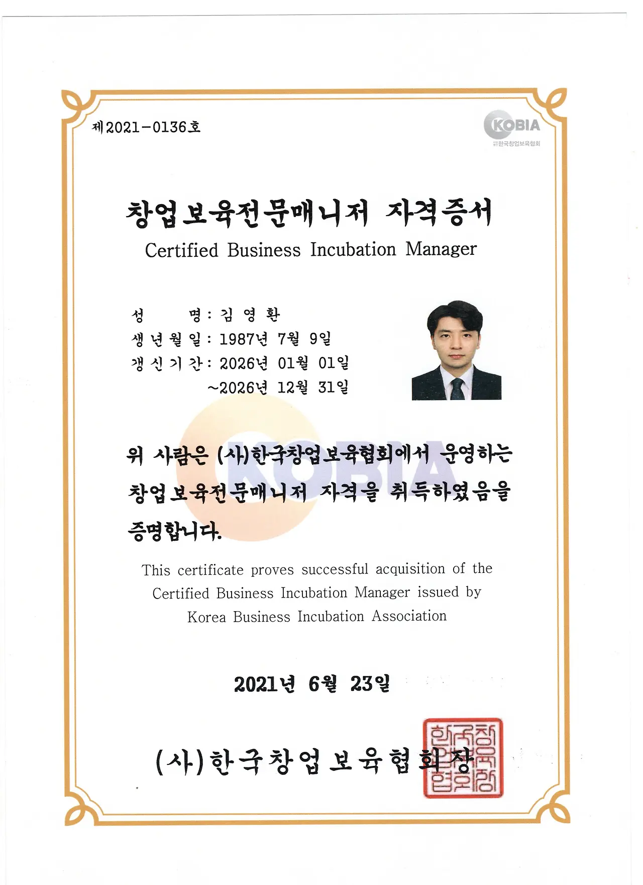 6개월 동안 독학해서 필기를 수료하고 실기를 전남대학교 창업보육센터에서 수료해 어렵게 취득한 자격증으로서 창업보육기관이나 창업 전문 공공기관에 지원하기 위해서 필요한 전문인력 자격증입니다. 실습 당시 전남대 창업보육센터장님께서 매우 의아해하셨던 기억이 있습니다.