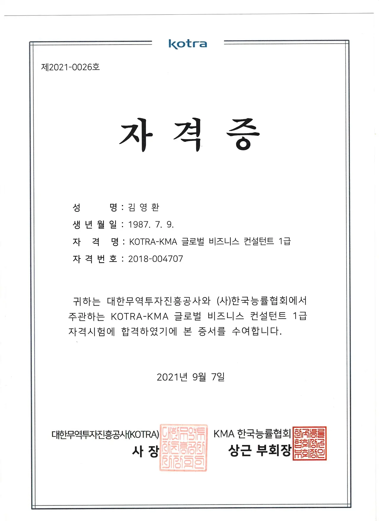 KOTRA(대한 투자 무역공사)에서 내수기업을 해외사업화 정책에 맞춰 전문 컨설턴트 자격증서입니다.