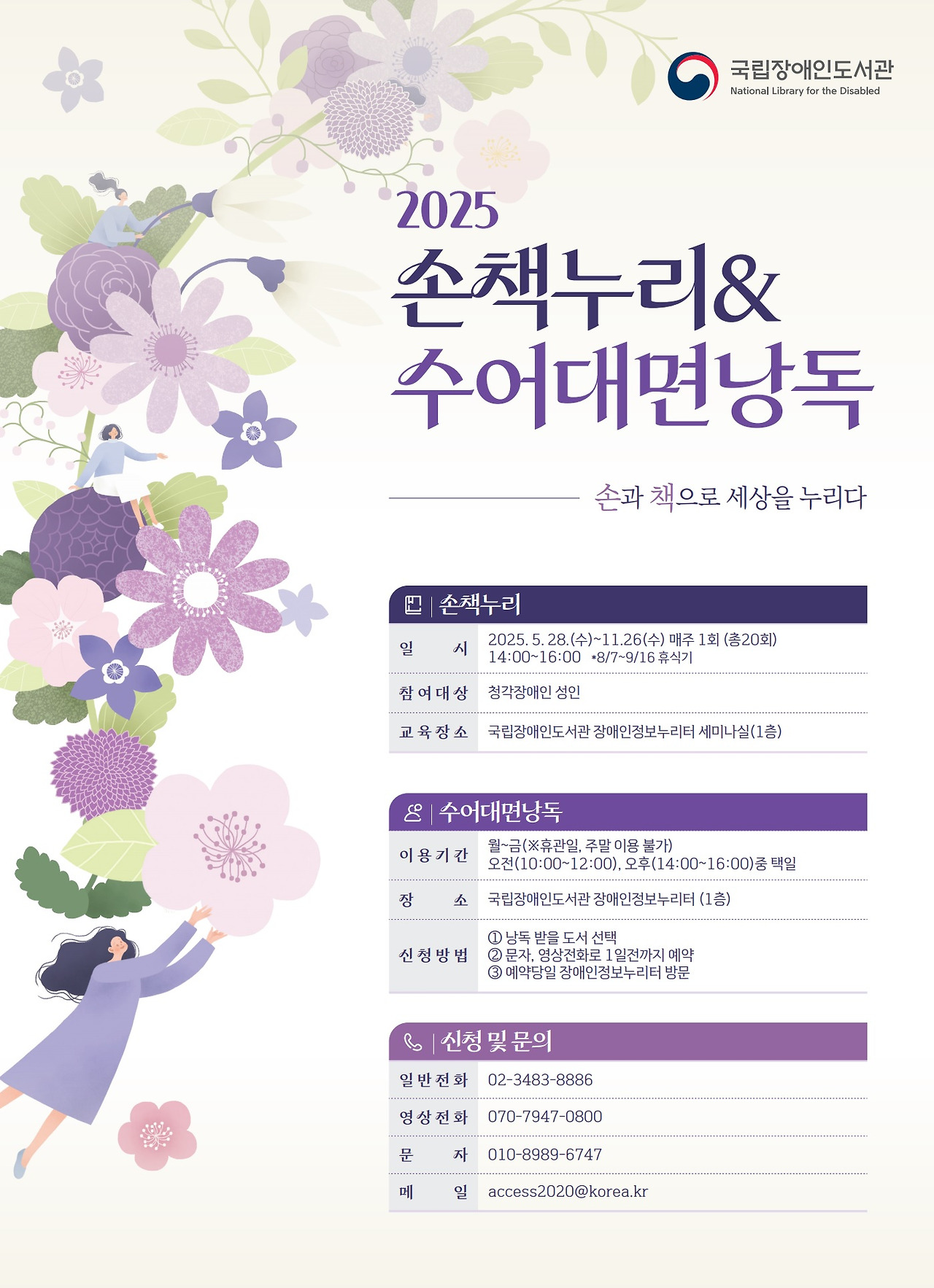얼마 전 국립장애인도서관에 견학 갔을 때 벽에 붙어 있던 포스터가 생각났다. 일대다 대면 낭독 서비스에 관한 포스터였다. 프로그램명이 생각나지 않아 검색해 손책누리 사업이라는 것을 알게 됐다.