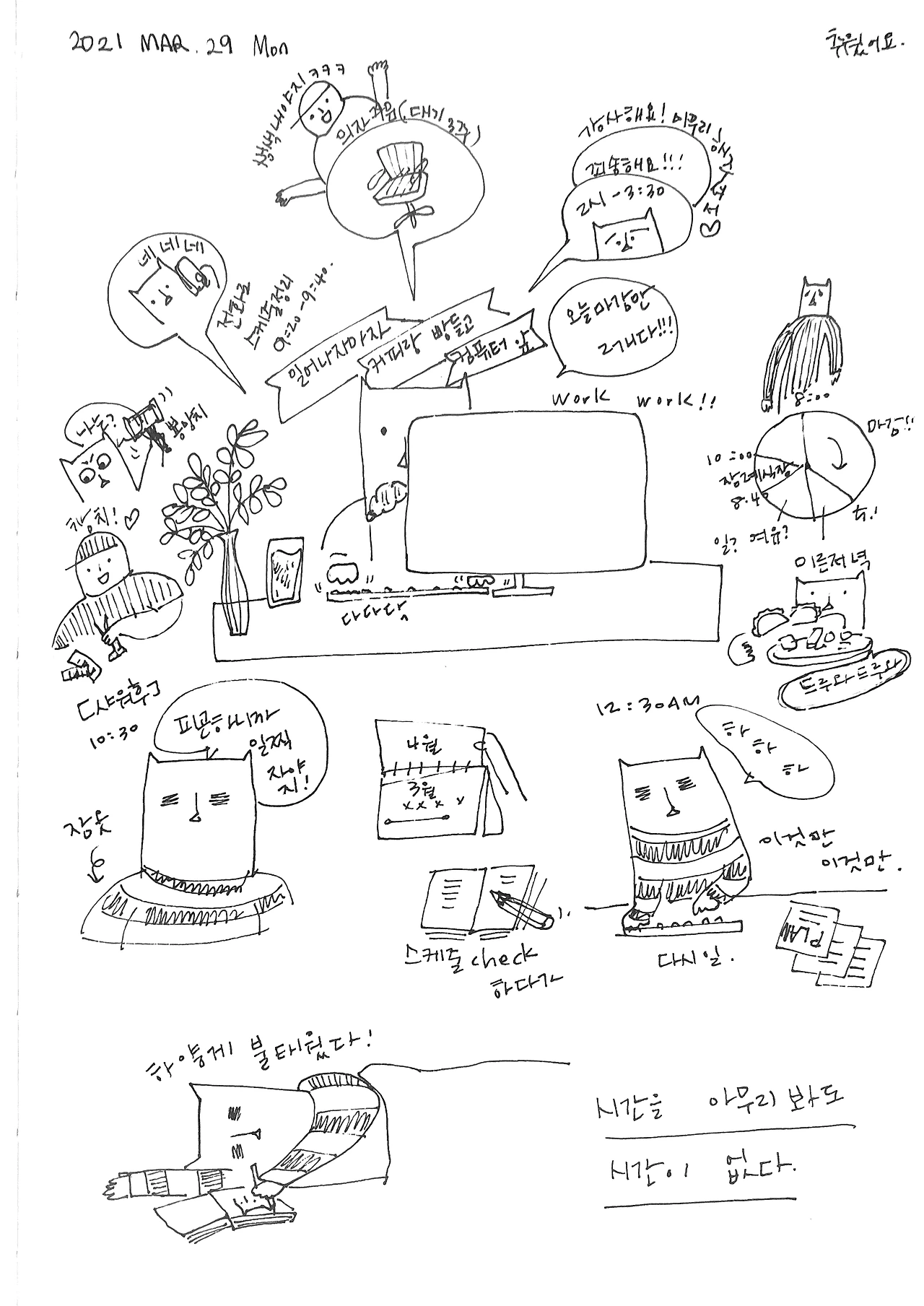 밥은 먹어야 하고, 잠도 자야 하는데 일은 줄이 지어있다.