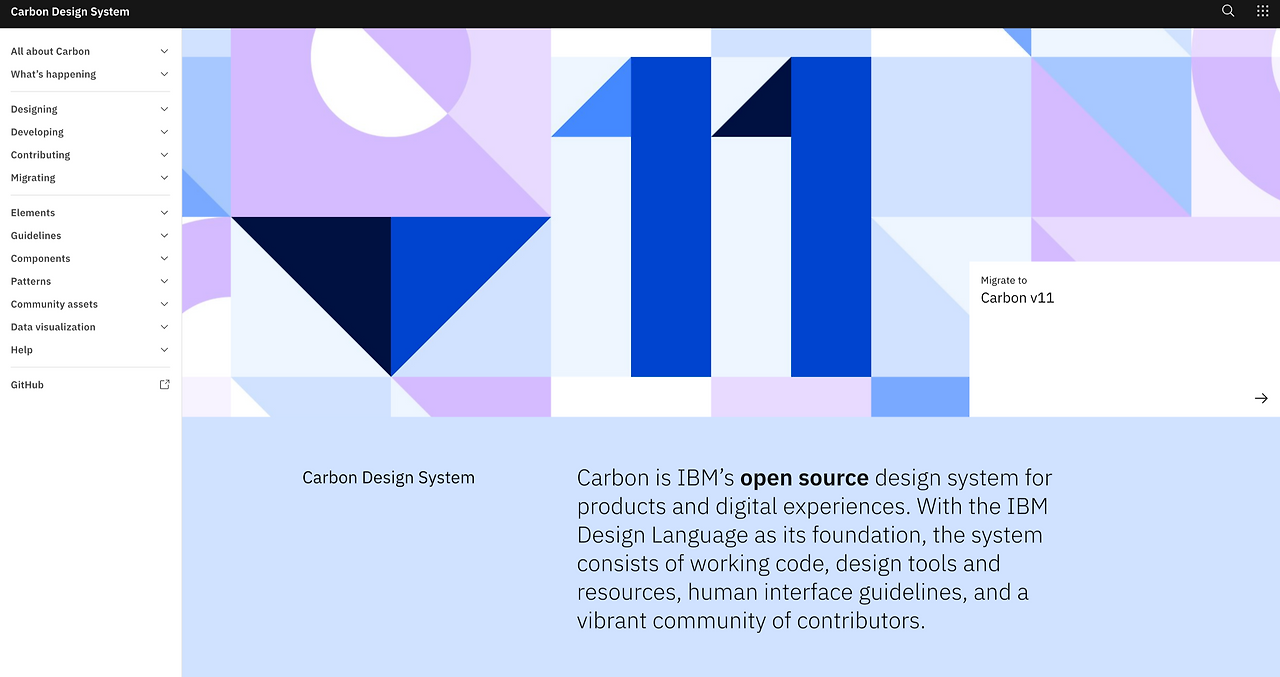 IBM의 Carbon Design System은 기업용 디자인 시스템으로, 웹과 모바일 애플리케이션을 위한 일관된 디자인 가이드라인과 UI 컴포넌트를 제공합니다. Carbon은 IBM의 디자인 철학에 기반을 둔 디자인 시스템으로, 접근성, 일관성, 재사용성 등을 강조하고 있습니다. 또한 Carbon은 개발자와 디자이너 간의 협업을 강화하기 위한 다양한 도구와 자료를 제공하고 있습니다.