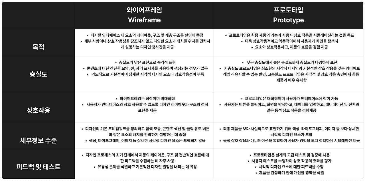 요약하면, 와이어프레임은 레이아웃과 구조에 중점을 두는 반면 프로토타입은 기능과 상호 작용에 중점을 둡니다. 둘 다 디자인 프로세스의 필수적인 부분으로, 디자이너가 사용자의 요구와 기대를 충족하는 사용자 중심 디지털 제품을 만드는 데 도움이 됩니다.