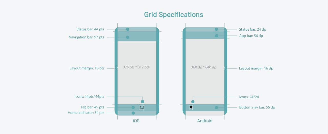 Android 및 iOS의 그리드 사양에서도 차이점을 나타냅니다. iOS UI는 포인트(pt) 단위로 개발됩니다. 머티리얼 디자인 지침을 갖춘 Android 앱은 밀도 독립적 픽셀(dp)을 사용하여 개발되었습니다.