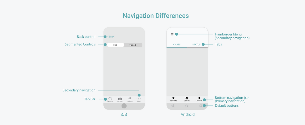 내비게이션은 Android 앱 UI 디자인은 하단에 뒤로 버튼이 있는 반면, iOS에서는 화면 왼쪽 상단에 있습니다. iOS의 기본 탐색 기능을 탭바라고 하며 하단에 위치합니다. Android 앱 UI 디자인에서 기본 탐색 모음은 하단에 위치하며 하단 탐색 모음이라고 합니다. Android 앱 UI 디자인에는 최상위 탐색을 위한 탭도 있습니다. Android의 탭은 동일한 수준 탐색을 위한 것이며, iOS의 분할된 컨트롤은 동일한 페이지의 콘텐츠를 제어합니다. iOS UI 디자인에는 보조 탐색의 탭 표시줄에 '자세히' 버튼이 있습니다. Android 앱에서는 왼쪽 상단에 햄버거 메뉴가 있습니다.