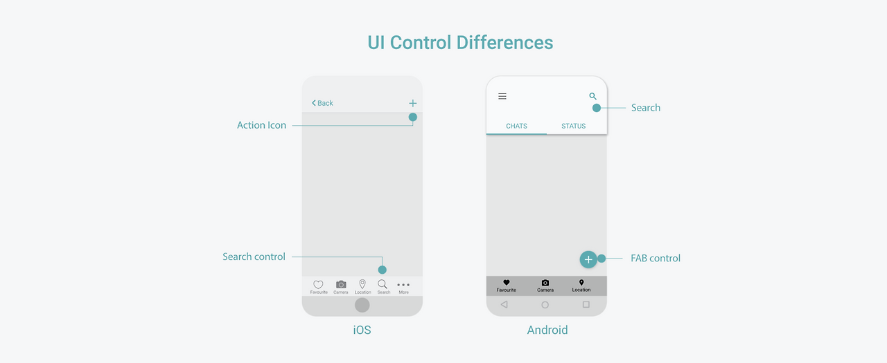 컨트롤은 시용자가 앱의 기본 창 영역에서 상호작용하는 UI요소이다. iOS 앱 UI 디자인에서 기본 클릭 유도 버튼은 오른쪽 상단에 있습니다. 이와 대조적으로 Android의 플로팅 작업 버튼(주로 오른쪽 하단에 있음)은 기본 클릭 유도 버튼입니다. iOS에서는 검색 아이콘이 일반적으로 탭 표시줄에 표시되는 반면 Android에서는 오른쪽 상단에 표시됩니다.