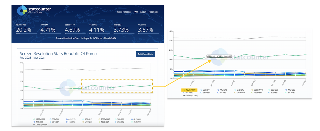 화면의 정밀도를 나타내는 지표로 시장 트렌드나 요구로 인한 해상도의 최대와 최소 기준을 찾는 것이 좋다. 해상도는 회사에서 기준을 가지고 있는 곳도 있지만, 아닌 경우도 있을 경우에는 이 부분에 대한 기준을 알아야 UI 디자인을 기획할 수 있다. 이때 statcounter사이트의 통계자료를 통해 현재 스크린 점유율을 파악하고 제시할 수 있다. 즉 아래로 검색해 봤을 경우, 최근 1년 동안 한국에서 가장 많이 사용된 해상도는 1920*1080px(PC)라는 것을 알 수 있습니다.
