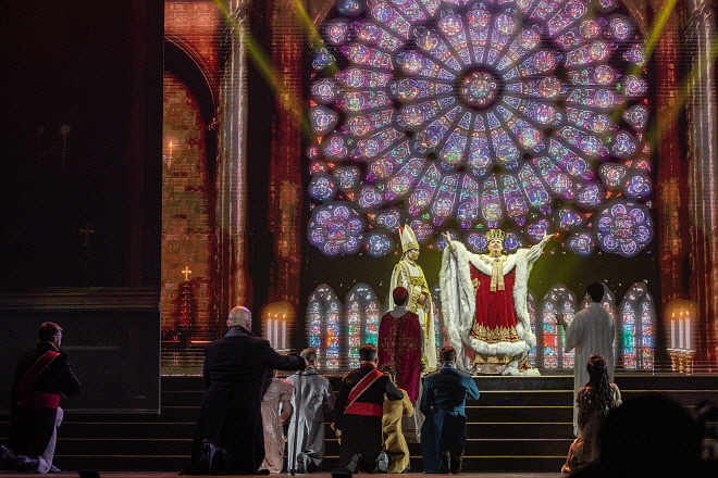 6개의 대형 LED 화면을 중심으로 이번 작품에서는 한국 라이선스 공연 때보다 LED를 적극적으로 사용하였다. 특히, 황제 대관식 장면에서의 성당의 화려한 스테인드글라스는 가히 아름다웠다. 전반적으로 LED 배경은 외젠 들라크루아(Eugène Delacroix)의 회화를 연상시키는 듯했다. 무대 양쪽에 프랑스 궁전을 표현한 듯한 기둥을 배치하여 양쪽에서 각기 다른 이야기를 전개하여 전개 속도를 높이거나 대립 관계를 형성했다. 양쪽으로 나눠진 무대는 기둥 사이의 큰 무대와 하나 되기도 하면서 이분화되었다. 다만, 앞서 언급했던 것처럼 무대가 무대 세트에 비해 다소 커 전반적으로 여백이 많이 생겼다. 이런 점이 다소 아쉬웠으나 다른 프랑스 뮤지컬인 <노트르담 드 파리>, <로미오와 줄리엣>을 생각해 봤을 때 프랑스 뮤지컬의 특징인 것처럼 느껴지기도 했다.