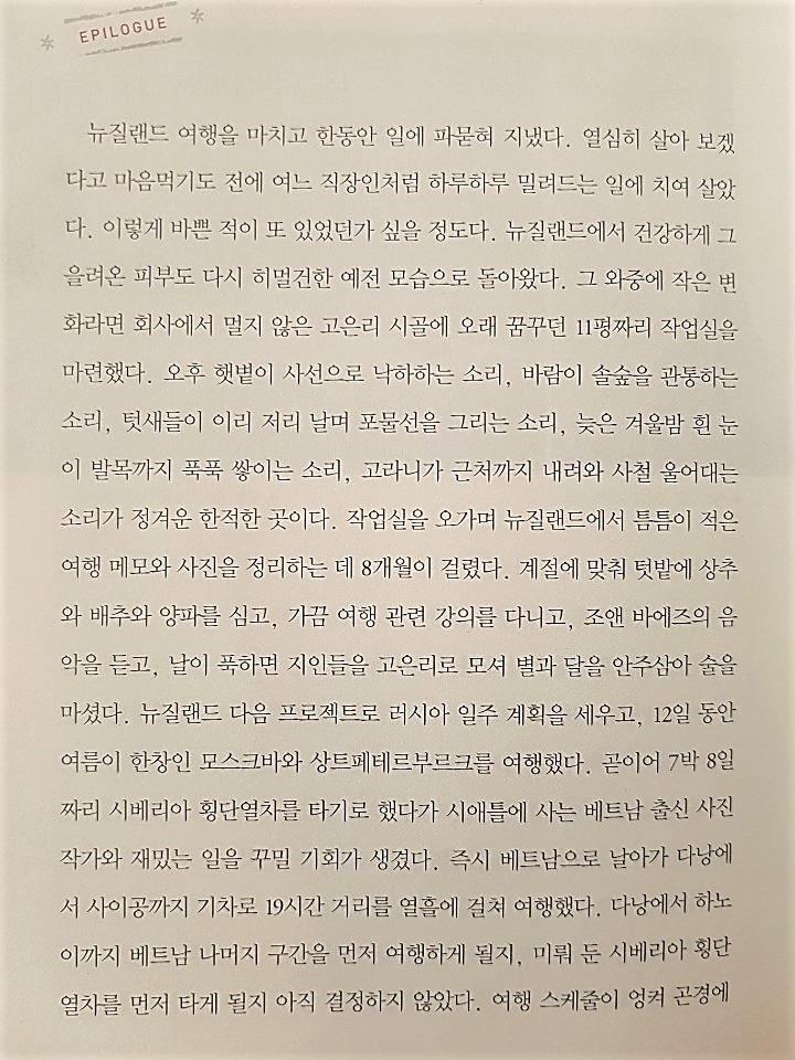 오후 햇볕이 사선으로 낙하하는 소리, 바람이 솔숲을 관통하는 소리, 새들이 이리저리 날며 포물선 그리는 소리, 늦은 겨울밤 흰 눈이 발목까지 푹푹 쌓이는 소리, 고라니가 근처까지 내려와 사철 울어대는 소리가 정겨운 한적한 곳이다. 계절에 맞춰 텃밭에 상추와 배추와 양파를 심고, 가끔 여행 관련 강의를 다니고, 조앤 바에즈의 음악을 듣고, 날이 푹하면 지인들을 모셔다 별과 달을 안주삼아 술을 마셨다.