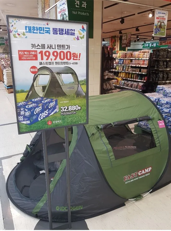 “네, 저는 텐트 욕심에 맥주를 다섯 박스나 샀다니까요! 한정 판매이니 어서 달려가세요.”