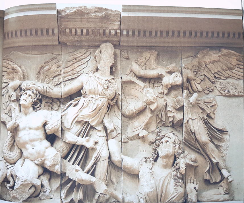 올림푸스 신들과 거인족과의 투쟁을 묘사한 이 석벽 부조는 거인족을 제압하고 승리자가 된 올림푸스 신들처럼 페르가몬 왕국의 아탈로스 왕이 갈리아인들을 물리친 것을 기념해 세우게 한 것이다. 바로 이 거대한 전시물을 보면서 세 명의 젊은 혁명가들이 미학과 역사철학을 토론하는 장면으로 책의 내용은 시작된다. 부조는 고대 그리스 로마 신화를 재현하고 있는데, 특히 제우스를 포함한 올림포스 신들이 반란을 일으킨 거인 족을 살육하는 장면이 극사실적으로 조각되어 있다. 하늘과 땅, 혹은 하늘의 자식들인 올림프스의 신들과 대지의 자식들인 거인족 사이의 전쟁이니만큼, 이것은 지배자와 피지배자 사이의 전쟁이라고 할 수도 있다.