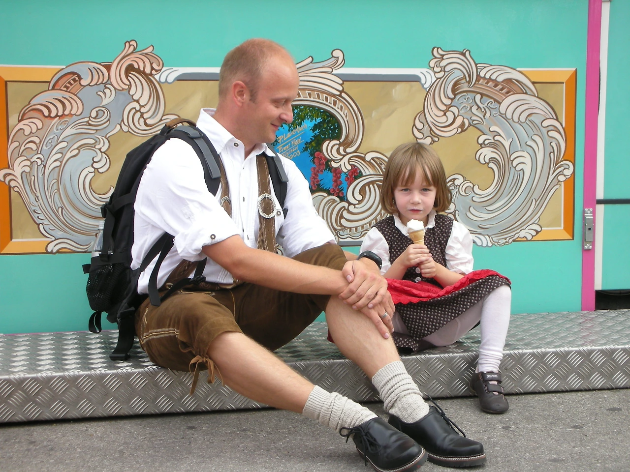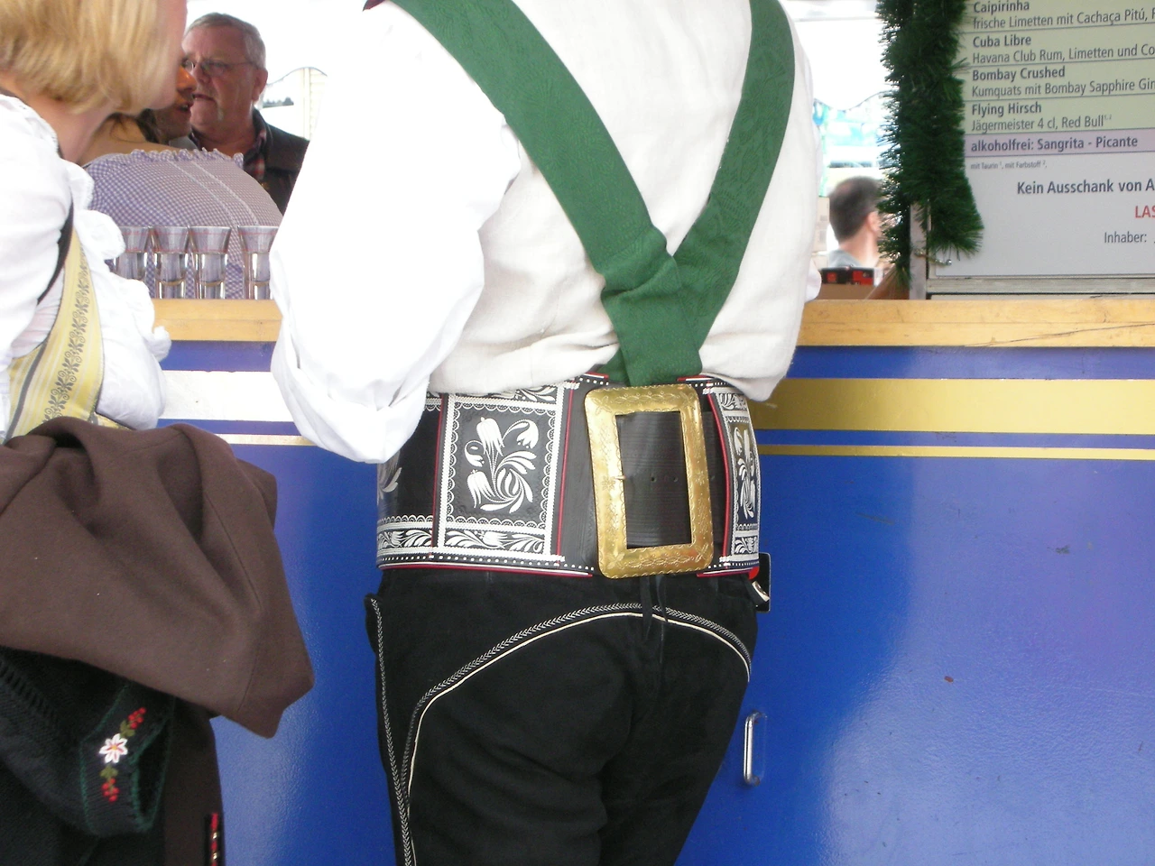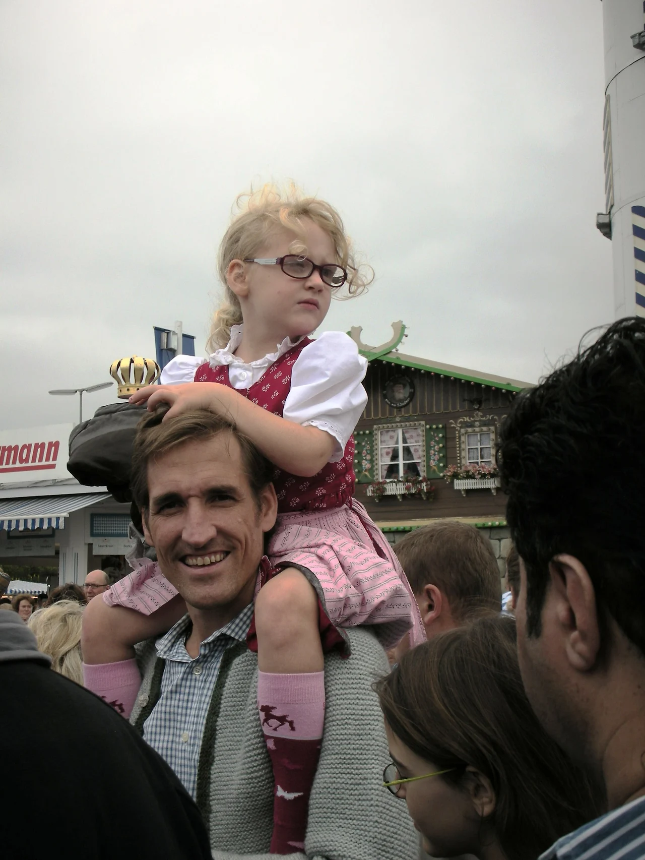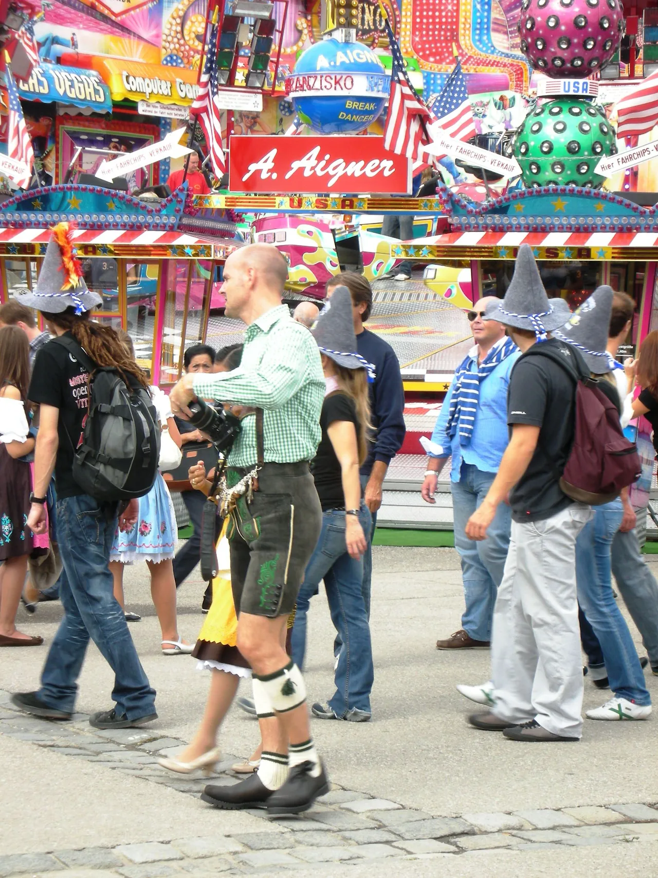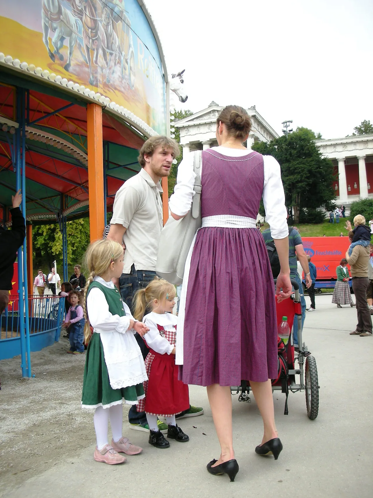 사실 옥토버페스트에 전통복식으로 오지 않는 사람은 딱 봐도 관광객이다. 그런데 관광객마저도 대충 저렴이로나마 전통복식을 대여해 입고 오거나 그거도 안 되면 모자라도 하나 쓰고 온다. 그만큼 전통복식 착용에 대한 암묵적 합의가 이뤄진 셈인데 이 점은 한국의 축제기획자들이 눈여겨 봐야 하는 점이다. 남자들의 가죽바지는 대를 이어 아들에게로 물려주는 것이고 그래서 그런지 이 축제의 전통은 참 맥이 길다. 이 가족처럼 딸 둘도 예쁘게 디른들을 차려입고 온 가족 나들이 객이 참 많다.