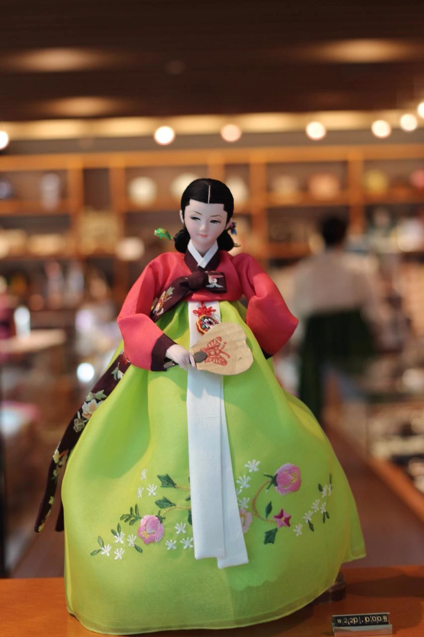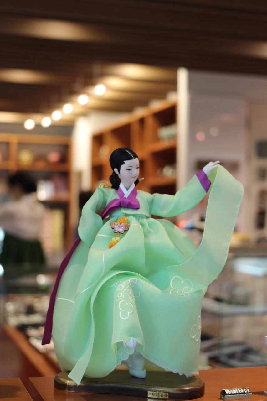 한국 전통인형도 아름답게 한복을 입혀 놓았다. 쪽진 머리도 단정하고, 진짜 비녀를 꽂고 있다. 풍성한 머리숱이며, 저 손에 든 부채하며, 치마의 꽃마저도 심지어 손자수다. 오른쪽 인형은 나빌레라 춤을 추고 있는데 저 속치마와 하얀 꽃신 좀 보소! 두 인형의 백미는 저 두꺼운 동정! 요즘은 두꺼운 동정이 유행하고 있는데 이 인형들에서도 두껍고 정확하게 각도를 맞춘 동정이 한복 전체의 균형을 맞추고 있다! 실제 옷 사이즈보다 인형 옷 만들기가 더 힘들다는데 어느 분의 솜씨인지 감탄이 저절로 나온다.