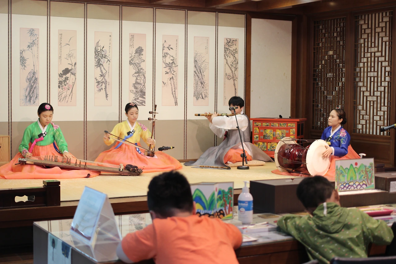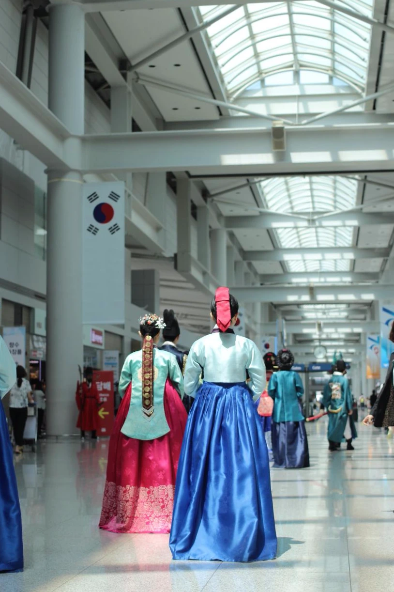 인천 국제공항에 일찍 도착하여 하릴없이 서성거렸다. 맘은 설레고 아직 시간은 많이 남았고 그때 나의 시선을 사로잡은 것은 단연 가야금과 해금, 대금과 장구를 치는 네 명이었다. 한복을 만들고 디자인하다 보니 시선도 달라져서 강의하고 연구하는 본업 때와는 훨씬 더 많은 것을 보게 된다. 배씨 댕기 한 모습이 참 단아하다. 자세히 보니 여인네 치마와 대금부는 도령의 바지까지 모두 살구색으로 하의 색은 통일하되 색이 겹치지 않게 가야금은 초록색 저고리, 해금은 연노랑색 저고리, 장구는 진한 파란색 저고리로 색을 달리했다. 고름 색은 달리 하나 또한 깃머리 부분을 검은색으로 달리하여 세 개의 금박을 찍어 다시 앙상블의 통일성을 살리고 있다. 특히 대금부는 도령은 연한 회색 답호를 입고 그 트임으로 주황색 바지가 보여서 아주 세련돼 보인다. 본견만이 낼 수 있는 여리려리한 색감은 단아하고 기품 있어 보인다. 뒤의 8폭 병품의 은은한 문인화와도 아주 잘 어울리지 않은가!