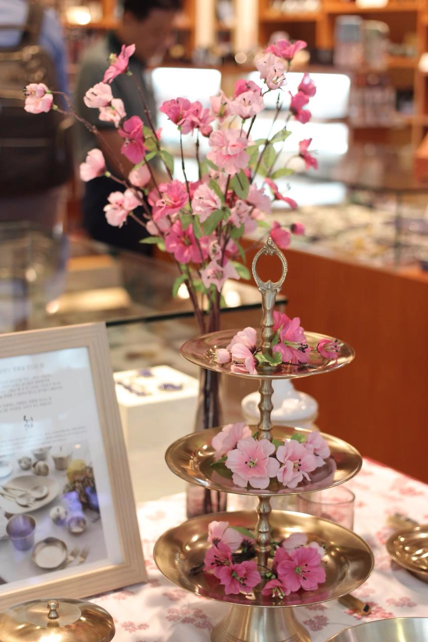 이런 afternoon tea 세트는 또 어떤가! 연분홍, 진분홍 진달래가 꽂혀 있는 화병 옆에 유기 삼단 트레이를 놓고 그 위에 또다시 연분홍, 진분홍 진달래를 얹어 놓으니 우아미가 이루 말할 수가 없다. 전통미에 다시금 감탄하며 삼단 트레이의 기둥 모양을 보니 이건 대나무!