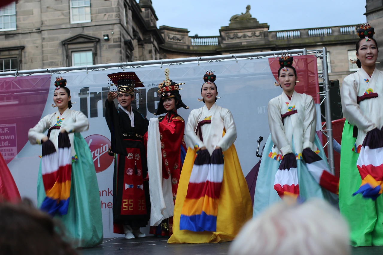 프린지 페스티벌에서 한국 공연단에 눈길이 갔던 것은 아름다운 한복이 늘 그렇듯이 나의 시선을 확 낚아채었기 때문이었고, 한국인의 눈이 아니더라도 그들의 아름다운 춤사위와 짙은 화장이 어딘가 모르게 격이 다르게 다가왔기 때문이었다. 비단으로 지은 한복에서는 은은한 광택이 고상하게 빛나고 틀어 올려 가지런하게 쪽 지은 머리와 그 위에 올린 족두리 그리고 그들 뒤에서 면류관을 쓴 왕과 화려한 활옷을 입고 대수머리를 한 왕비는 한눈에 봐도 화려했다. 한국의 왕실이 이렇게 대중 친화적이었나 싶을 정도로 어가 행렬은 인천공항 출국장에서만 볼 수 있는 게 아니라 이곳 에든버러 로열 마일에도 출몰했다. 영국 왕실도 스웨덴 왕실도, 네덜란드 왕실이나 일본의 왕실처럼 현재 존속하는 왕실에서는 볼 수 없는 장면이다. 이미 역사 속으로 사라진 조선 왕가는 일말의 미련도 없이 그 이미지를 소진하고 있었고, 조선 황제국의 위엄은 무대 안에서밖에 존재하지 않았다. 프린지 페스티벌에서 만난 어가 행렬은 이미지로 소비되는 허상이었고 스코틀랜드의 현재처럼 자랑스러운 과거와 궁핍한 현재 사이에서 스산하게 흔들리는 바람소리였다.