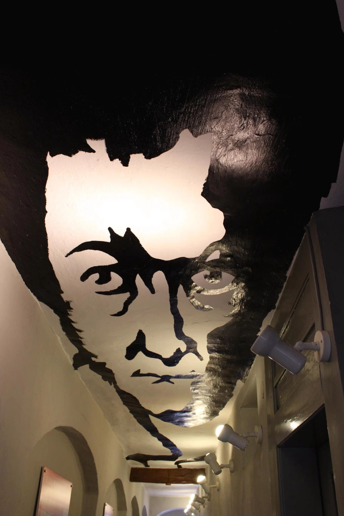 박물관 문을 밀고 들어서면 저 반대편에 호프만의 정원으로 나가는 문이 있다. 그 곳에서 쳐다 본 천정, 무서운 흑백의 호프만이 집 천정을 온통 뒤덮고 있다. 박물관은 첫인상을 결정하는 입구부터 문의 손잡이, 정원, 정원으로 나가는 문, 정원의 조경과 조각, 집 안의 전시내용과 전시 품목을 여러 해에 걸쳐 수정해 나가고 있다고 한다. 방문객의 국적을 조사하고 새로 나온 디지털 기술을 활용하는 등...매체의 변화가 기억의 보존에 미치는 영향을 반영하려고 애쓰며, 이 과거의 인물이 현재 어떤 모습으로 기억되어야 하는가를 고민한 흔적이 보인다.