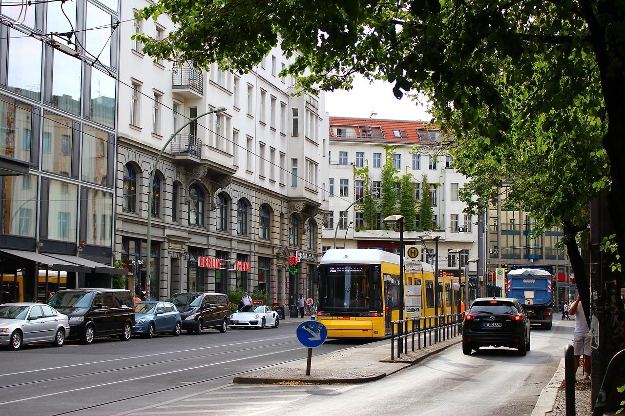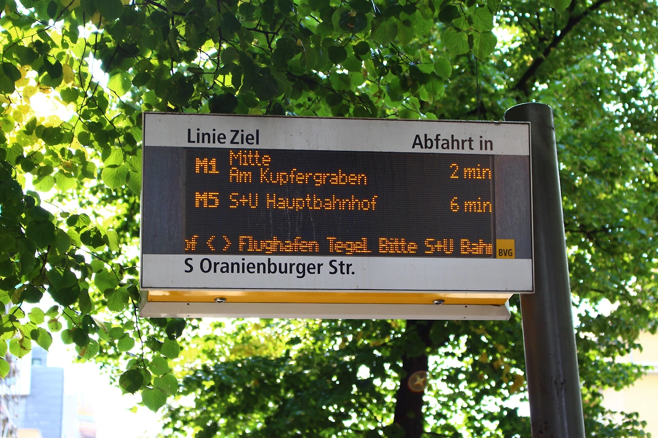 교통표지판 읽는 법: M1이라는 트램이 Mitte, Am Kupfergraben 쪽으로 가는 데 2분 뒤에 도착한다. 자주 다닌다. 베를린에서는 트램을 타는 게 좋다. 지하철보다 밖을 구경하며 다닐 수 있고 쾌적하다. 물론 관광객들에겐 100번, 200번 버스가 가장 좋다.