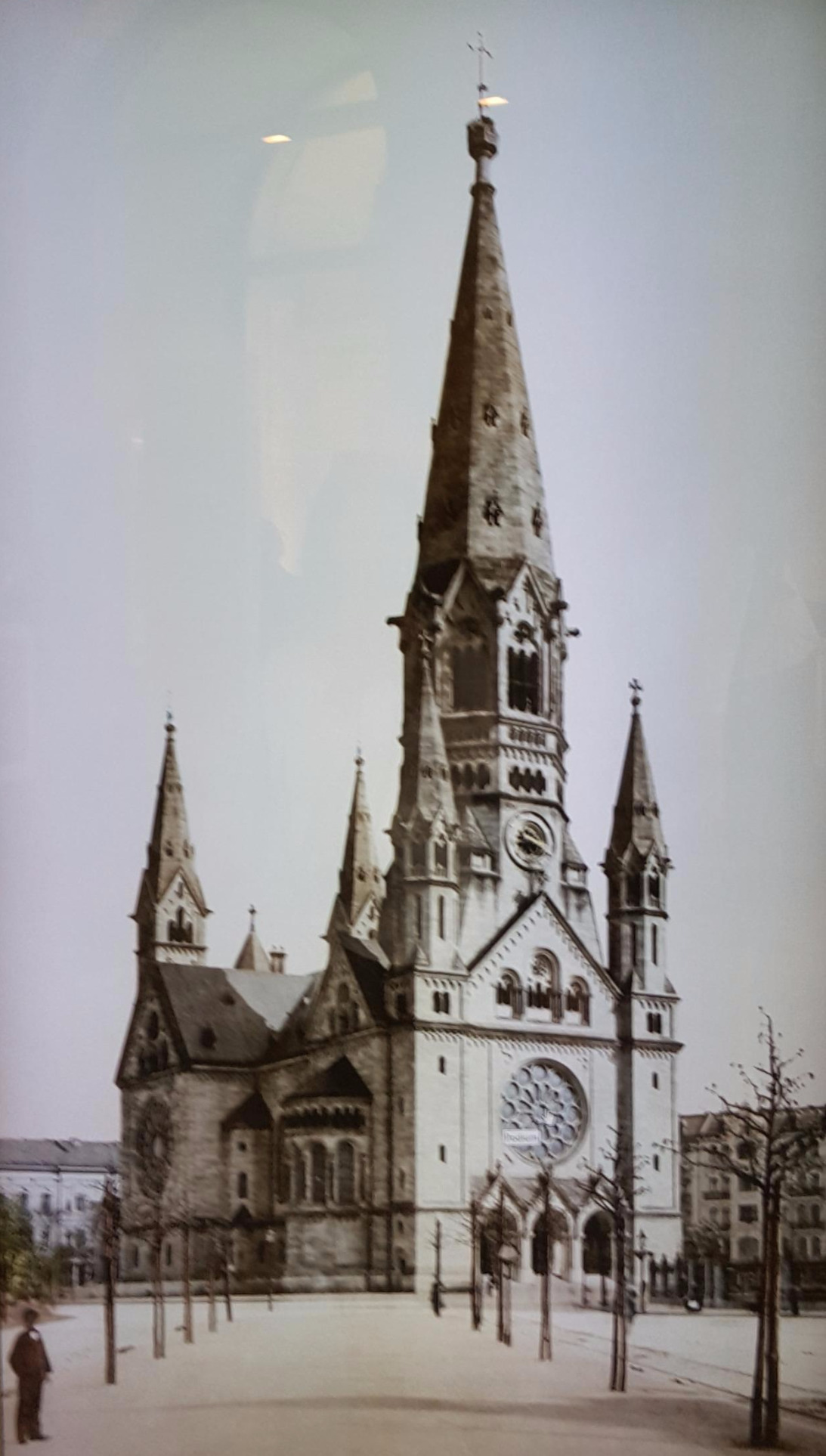 설립 당시 이 교회의 온전한 모습. 저 북쪽 지방 프로이센의 수도 베를린에 이 건물을 지은 건축가는 서쪽 쾰른 출신의 '프란츠 슈베히텐Franz Schwechten'이다. 로마의 흔적이 아직도 남아 있는 쾰른 출신이니 신로마네스크 양식은 그에게 별로 새로운 것이 아니었고 서쪽 도시 본 Bonn에 있는 뮌스터도 로마네스크 양식일 정도로 그곳에선 흔한 양식이었다. 그러나 당시 브란덴부르크에서는 이 양식을 전혀 알지 못했었다고 하니 신기한 건물이었을 것이다. 먼 나라 넓은 나라~