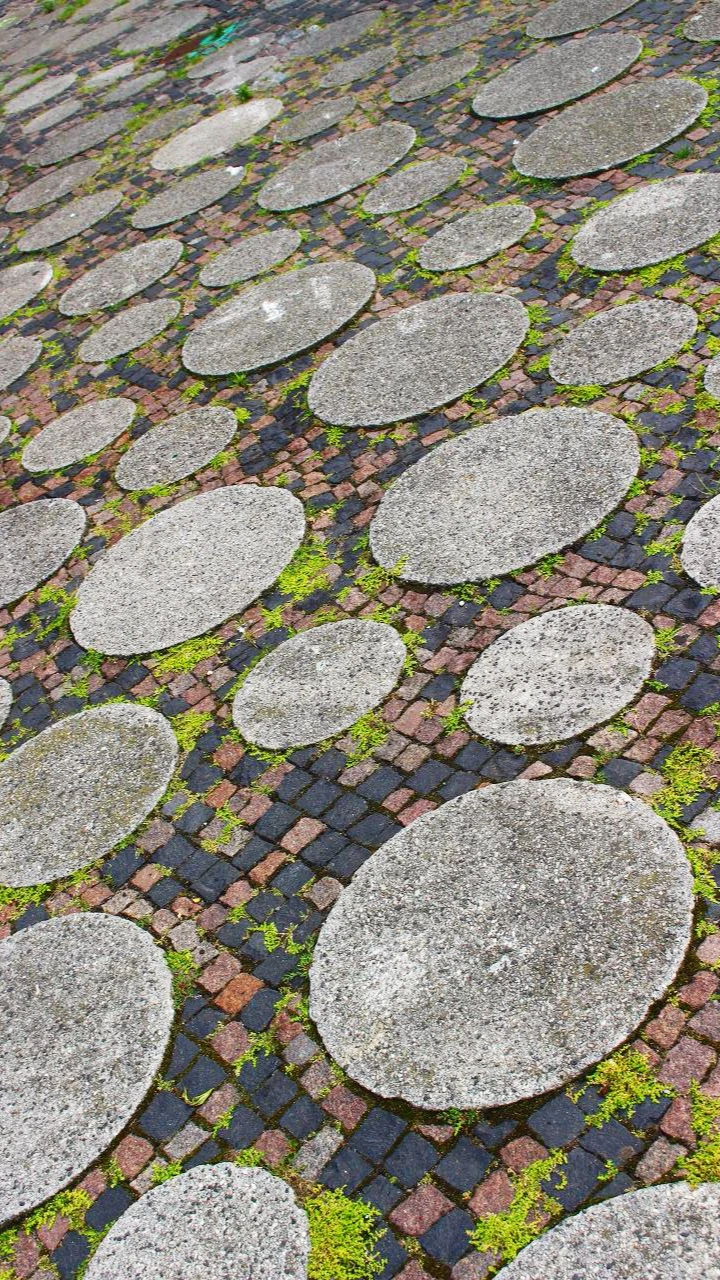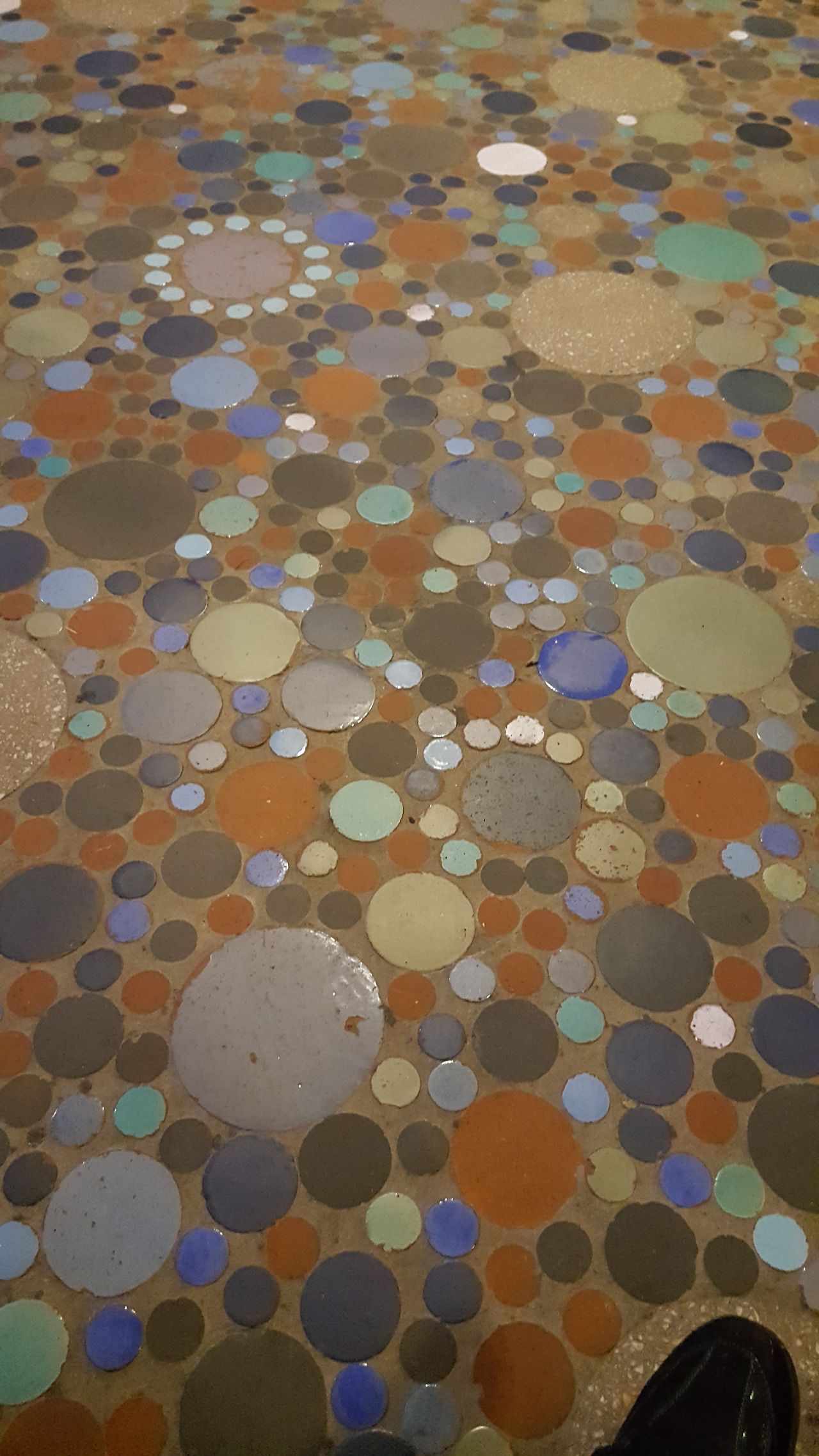 뿐만 아니다, 교회 안에 깔린 동글동글 부드러운 갈색 조의 타일은 밖의 보도블록 형태와도 일치한다.
