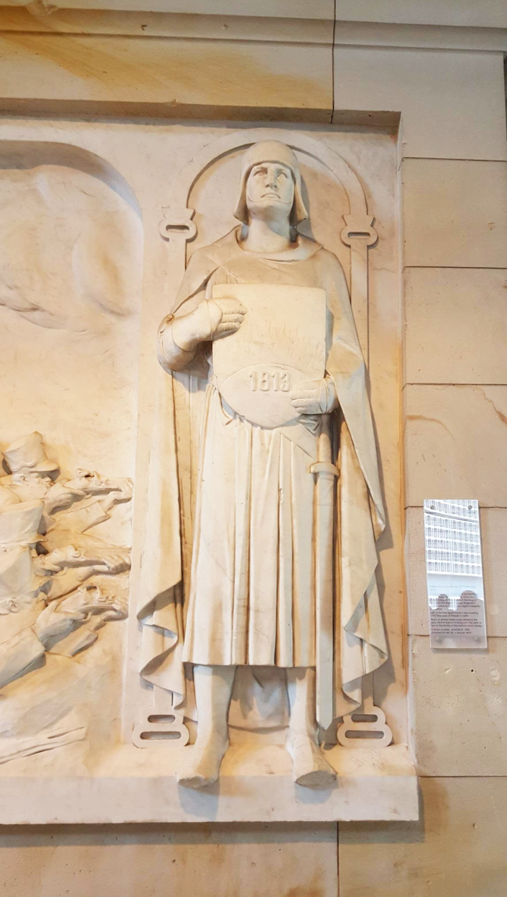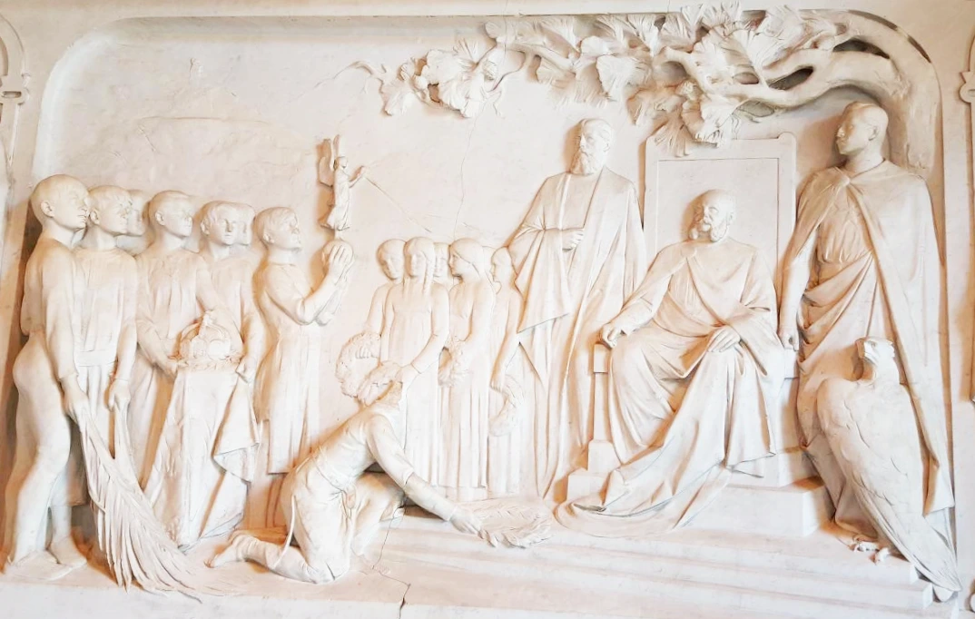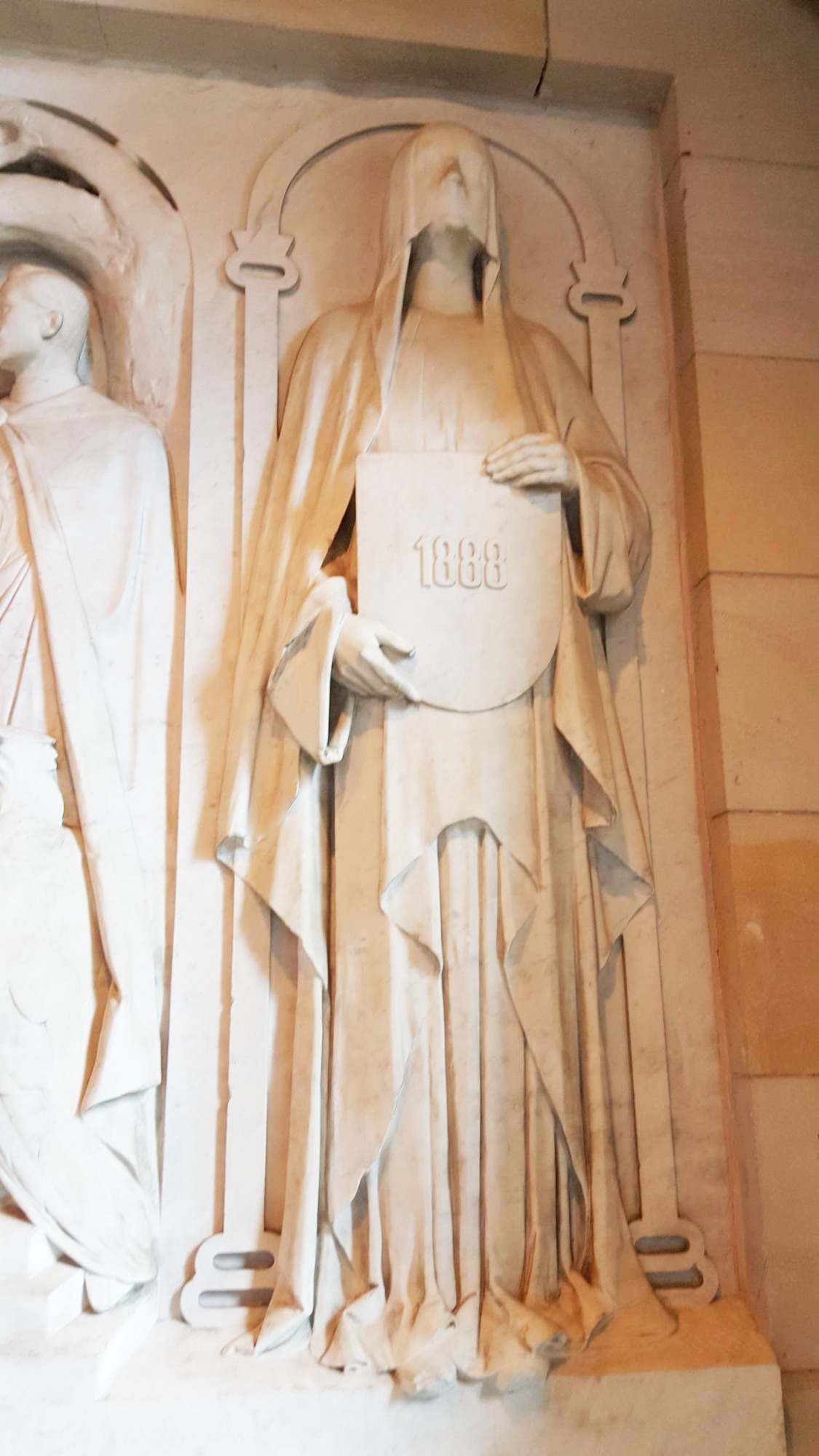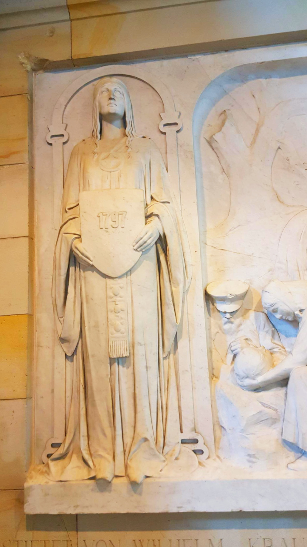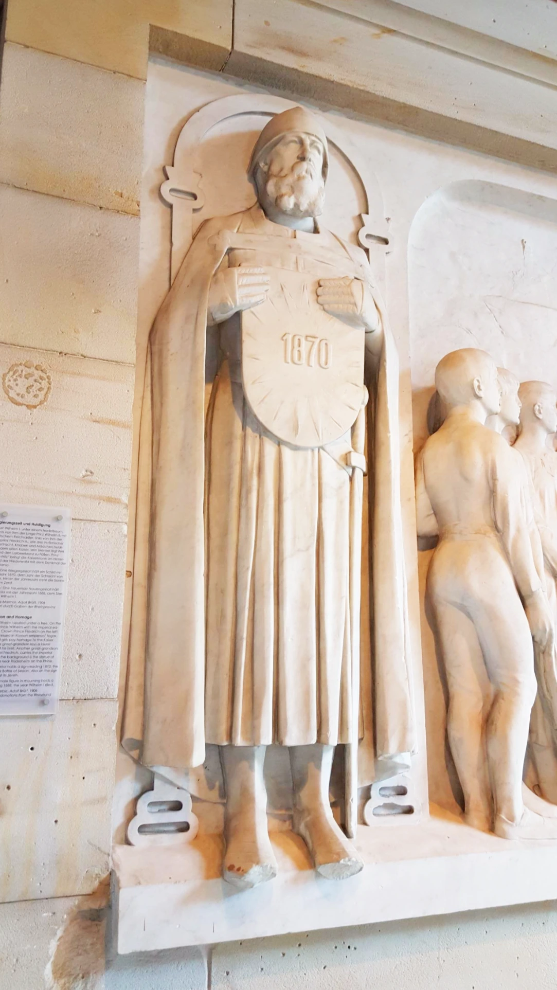 교회 오른쪽 부조판에는 수염을 기른 건장한 모습의 남자가 1870년도 년도판을 들고 있다. 1870년 이전까지 아직 군소국가들로 분열되어 있던 독일 땅이었다. 그 군소국가 중 북쪽의 신생 강국 프로이센이 나폴레옹 3세와의 전쟁에서 승리한 해가 바로 1870년도다. 한낱 프로이센의 왕이었던 빌헬름이 이 곳에서 독일 제국을 선포하고 제국의 황제로 등극한다. 그 유명한 베르사유 궁전의 거울의 방에서 일어난 일이다. 1871년에 공식적으로 독일 제 2 제국이 출범한다. 이 1870년은 프랑스에겐 참 굴욕적인 해이지만 독일인들에게는 정말 기억할만한 자랑스러운 해였을 것이다. 빌헬름 1세는 1888년에 사망한다. 빌헬름 1세의 출생과 사망연도는 이 두 부조상의 처음과 끝 연도와 일치한다. (1797~1888) 퍼즐 완성!
