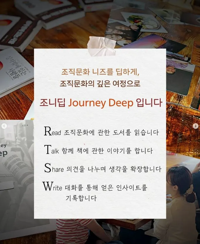 우연히 인스타에서 발견 후 신청해서 올해 상반기를 함께했고, 매번 모임마다 인사이트를 가득 안고 나왔다. 그리고 망설임 없이 이번 기수에도 참여하게 되었다. 트레바리 모임과 비슷하게 책을 읽고, 발제문을 뽑아서 이야기를 나누지만 두 모임의 특성은 많이 다르다. 트레바리 모임은 주로 다른분들의 이야기를 듣고 질문을 하면서 배워간다면, 조니딥 모임에서는 내 이야기를 할 기회가 많다. 그래서 내 이야기를 하면서 생각을 정리하거나 몰랐던 것을 깨닫기도 한다. 호스트인 제명님이 교육과 퍼실리테이션 전문가이기도 하셔서 모임 운영에도 이런 기법들을 종종 사용하신다. 단순히 "이야기 나눠보세요", "의견 있는 분 말씀해주세요" 가 아니라 모두가 이야기할 수 있는 장치들이 있다. 덕분에 이런 저런 강의 기법을 배우기도 하고, 실제 모임에서도 사람들과 좀더 밀도있는 대화를 나누고 있다.