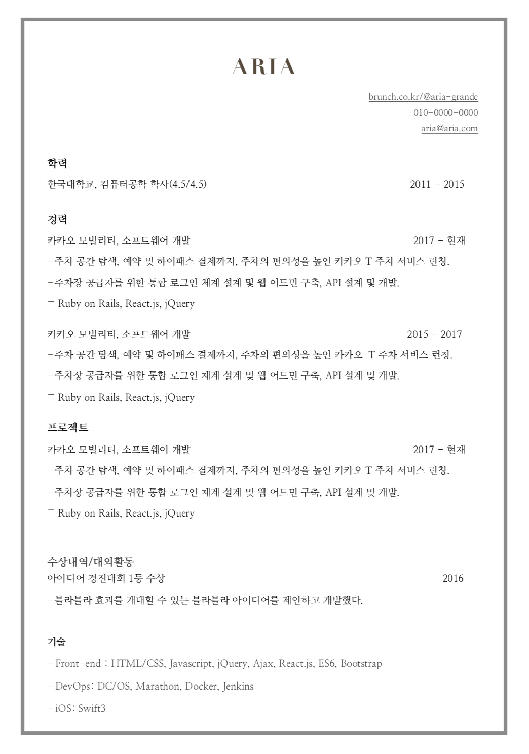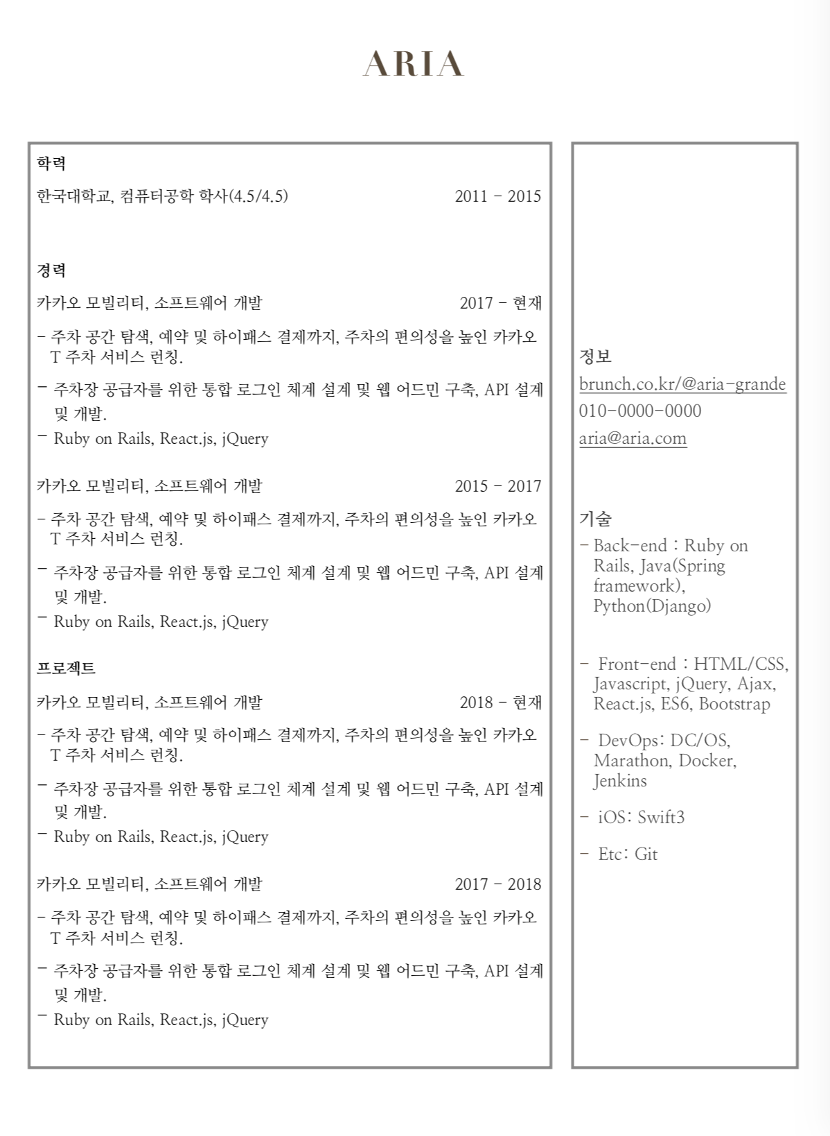 분량을 1 장 내에 맞추기 위해 줄간 간격을 좁혀서 넣어보려 애쓸 때가 있었다. 눈에 피로를 주면 읽어볼 것도 안 읽게 된다. 적당한 여백을 주자!