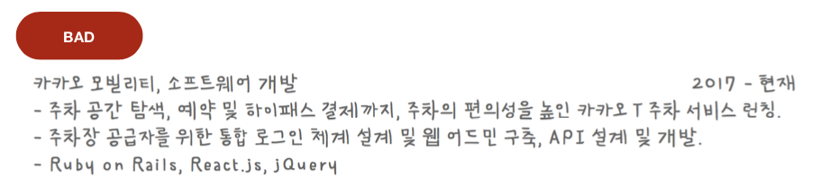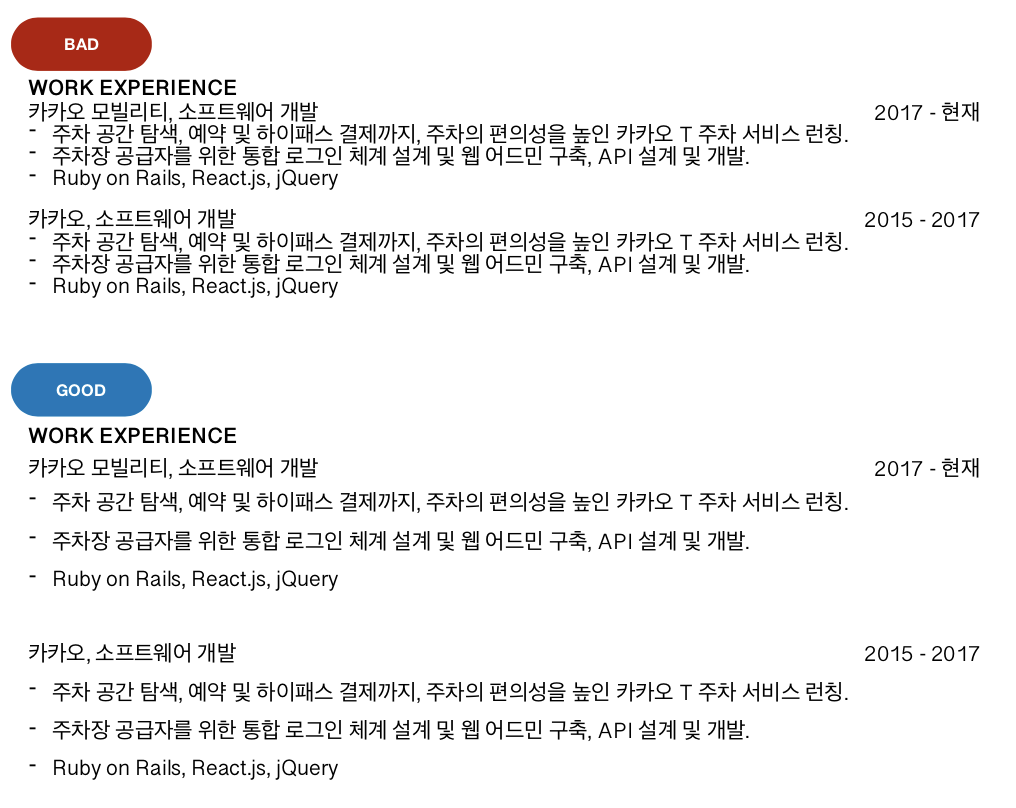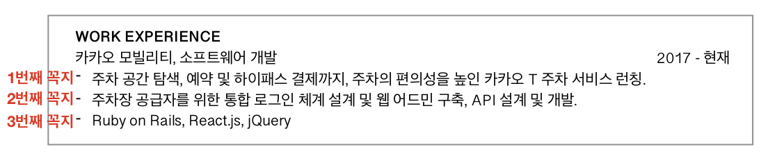 컨벤션을 만들자. 각 프로젝트 별 첫 번째, 두 번째... 꼭지가 어떤 의미를 담고 있을지 정하고, 이 형태에 맞추어 작성하자. 예를 들어 '경력' 사항에 대해 다음과 같이 정하고 작성할 수 있겠다.