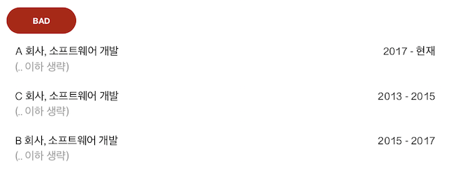 카테고리(경력, 프로젝트, 대외활동,...) 내의 모든 헤더는 최근 시간순으로 정렬하는 것이 좋다.