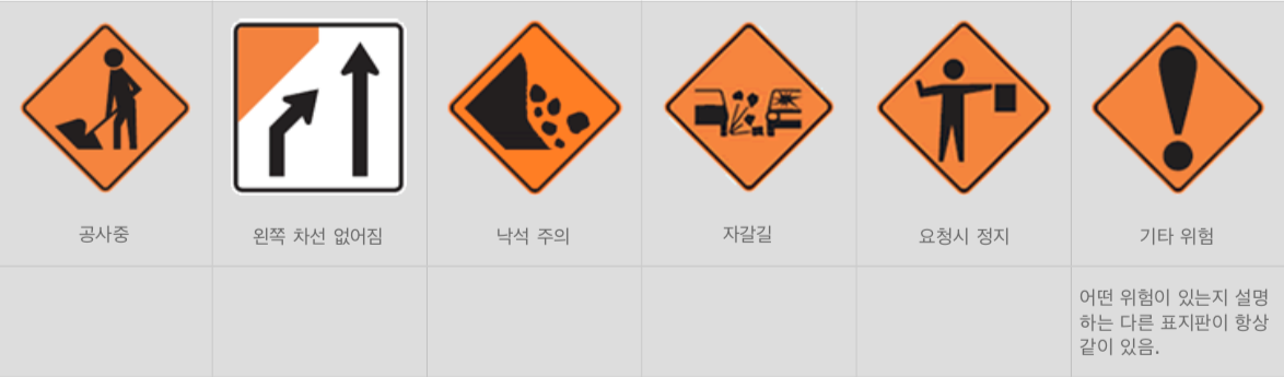 일시적인 경고 표지판은 주황새고가 검정색으로 구성되어 있다.