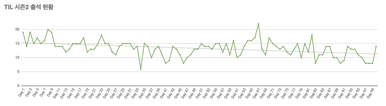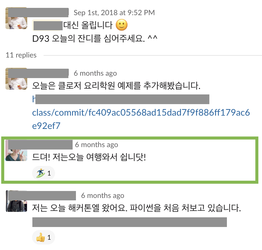 중간에 바뀐 제도로 공부 출석률은 올라가지 않았지만, slack 접속 출석률은 올라가서 남들이 뭘 하는지라도 보게 돼 도움이 됐어요.