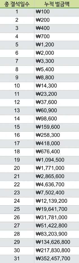 피보나치는... 초기 1~3일까지는 벌금이 오히려 원 제도보다 적어서, 초기 결석을 쉽게 유도한다는 단점이 있었습니다. 백 원인데 쉬지 뭐, 이백 원인데 쉬지 뭐, 이런 생각이!ㅠㅠㅋㅋㅋ 죄송합니다.ㅠ