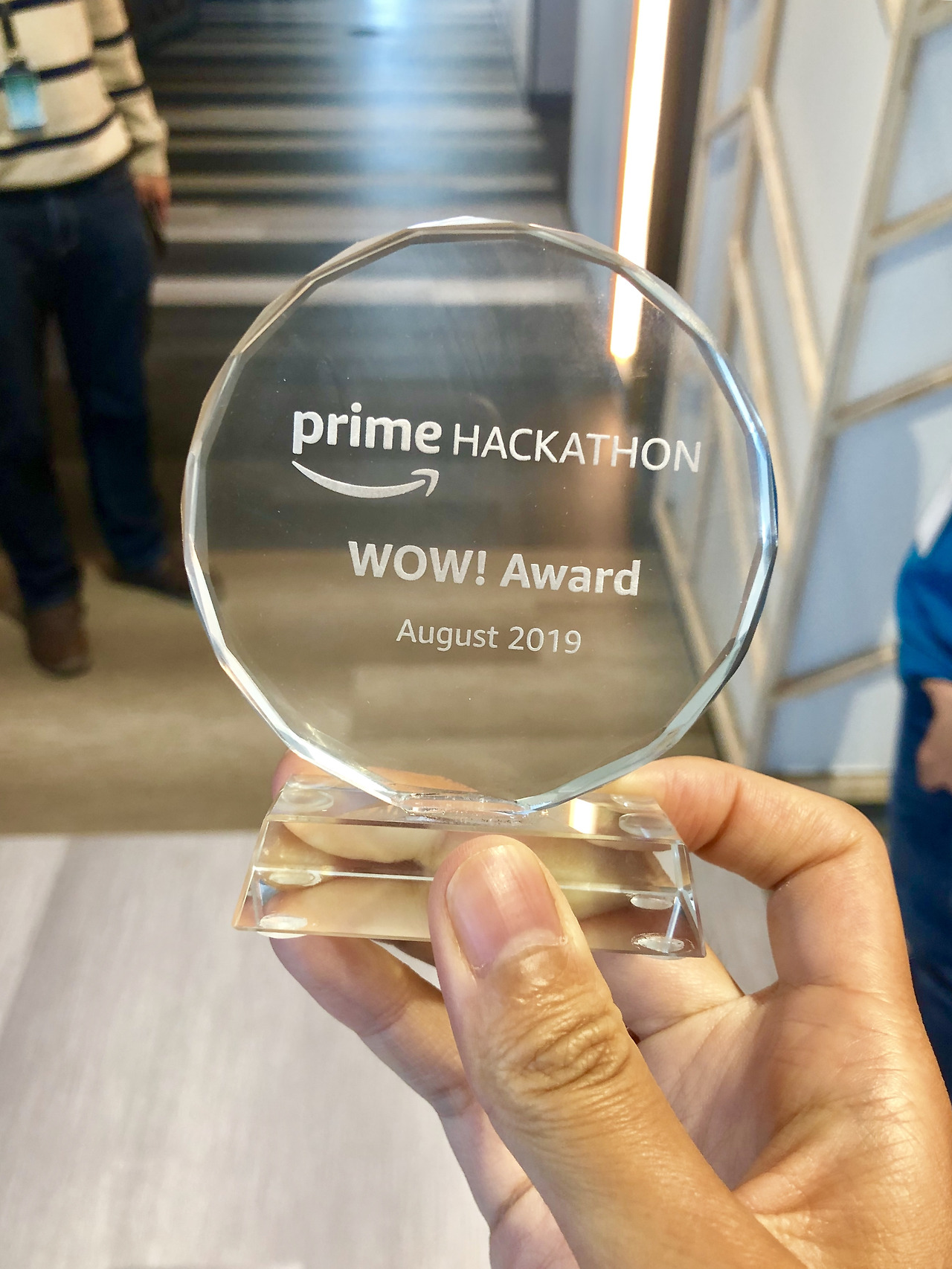 Leadership principle에 나오는 것처럼, disagree and commit을 하는 순간도 있었지만, 해커톤을 진행하면서는 시간 가는 줄 모르고 열심히 개발했다. 역시 내가 재밌어하고 좋아하는 분야는 기획하고, UI를 고민하고, 프론트 단을 구현하는 것임을 다시 한번 깨달았다. 모두가 각자의 역할에서 열심히 해준 결과, 우리 팀은 Wow award를 수상했다! 상패의 크기는 절약 정신을 의미하듯 매우 작고 귀여웠다. 팀원이 6명이었지만 상패는 하나였다. 그 팀 근처를 지나가면 상패를 볼 수 있어서 기분이 좋아지곤 한다.